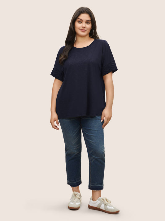 Plain Textured Crew Neck Cuffed Sleeve T-shirt