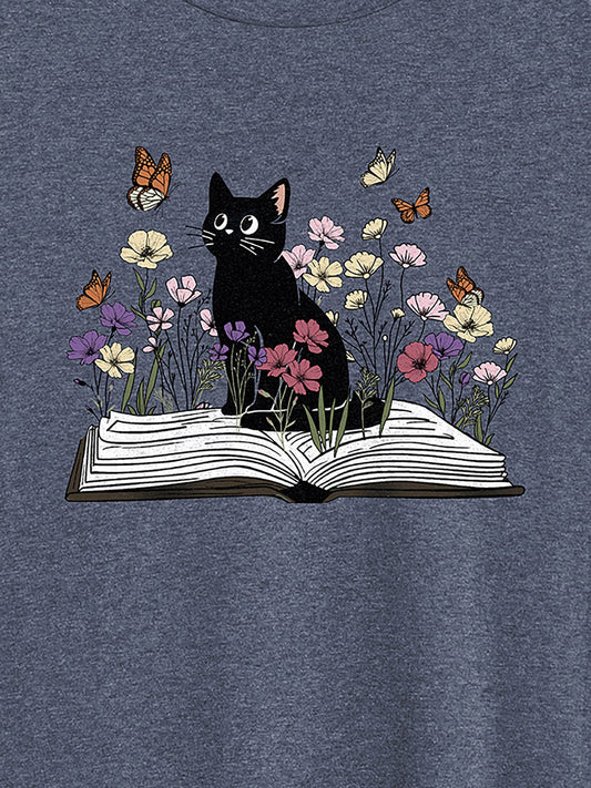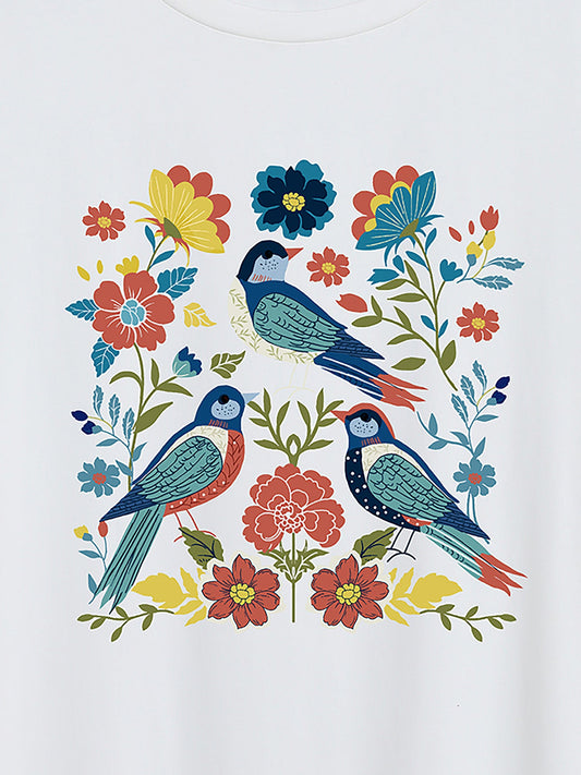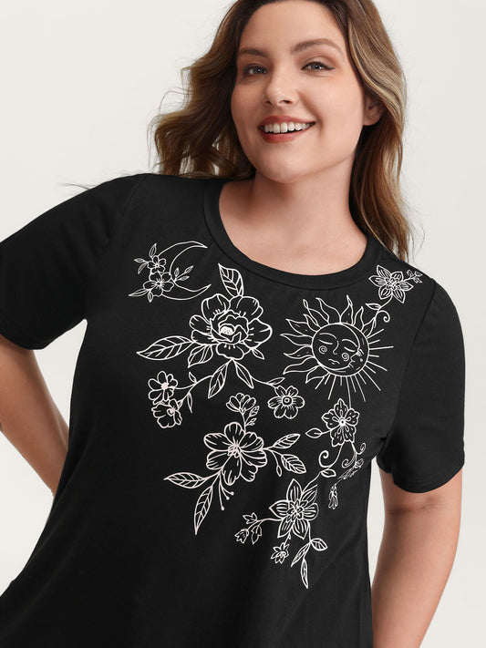 Floral Patchwork Round Neck Striped Ruffle Trim T-shirt