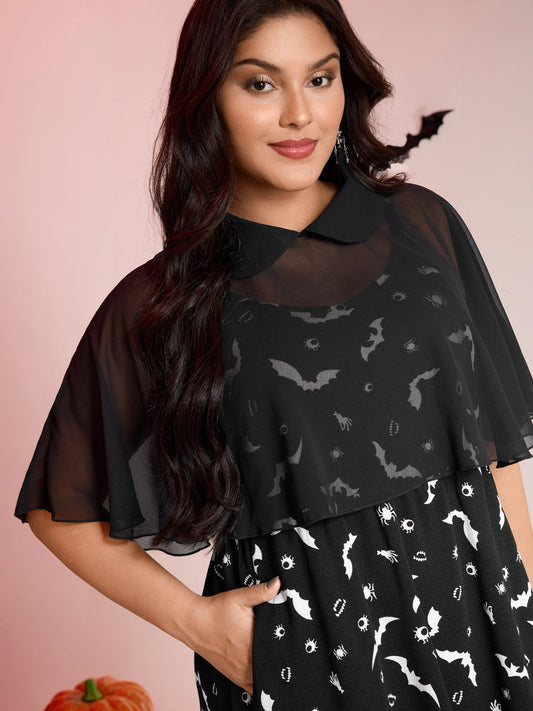 Halloween Bat Print Contrast Two-Piece Midi Dress