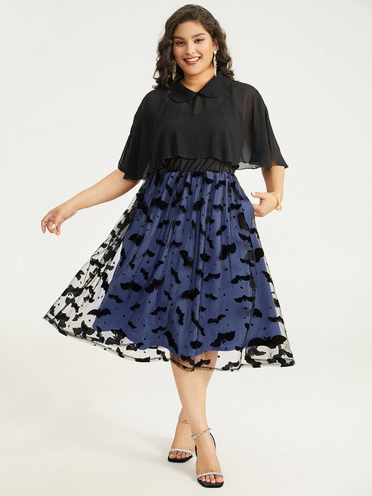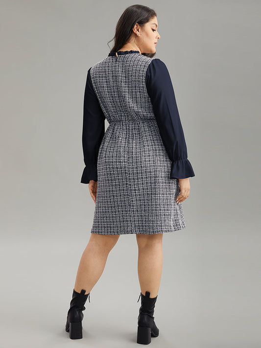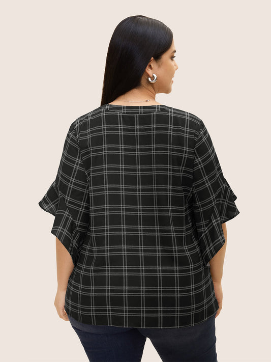 Plaid Notched Patchwork Ruffle Sleeve Blouse