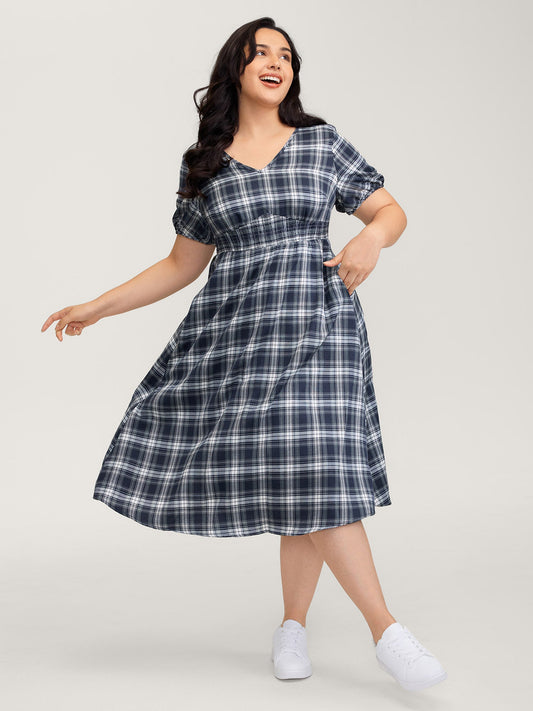 Cotton Plaid Print Shirred Neck Puffy Blouse