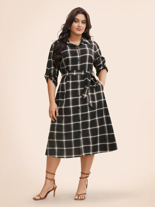 Plaid Shirt Collar Belted Tab Sleeve Dress