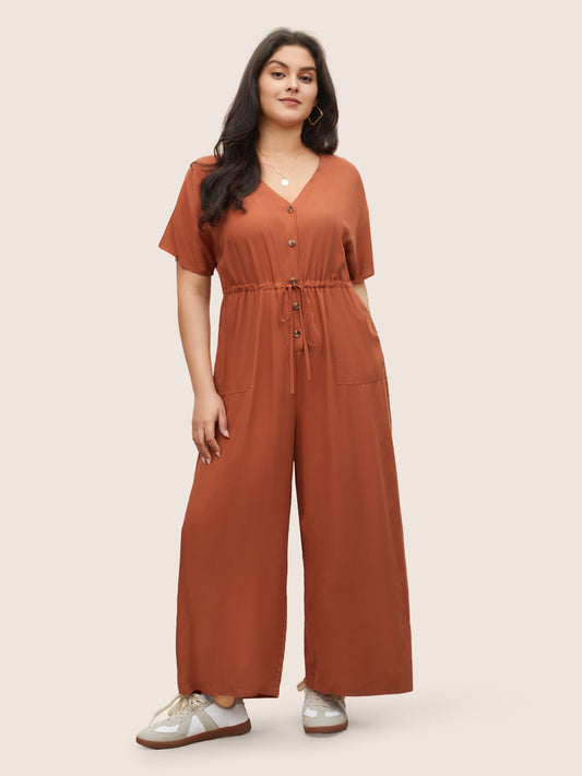 Plain Button Up Drawstring Gathered Pocket Jumpsuit