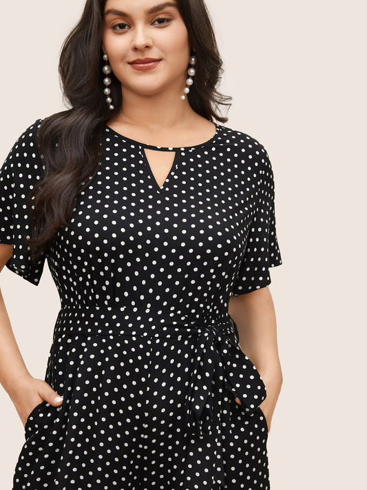Polka Dot Cut Out Zipper Belted Jumpsuit