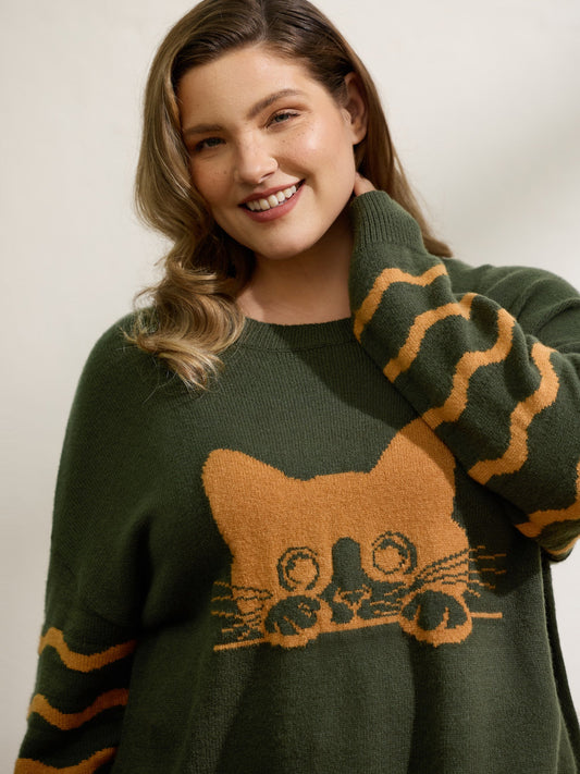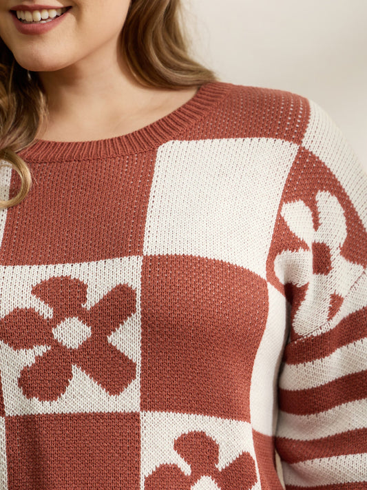 Checkered Floral Stripe Sleeve Jacquard Pullover