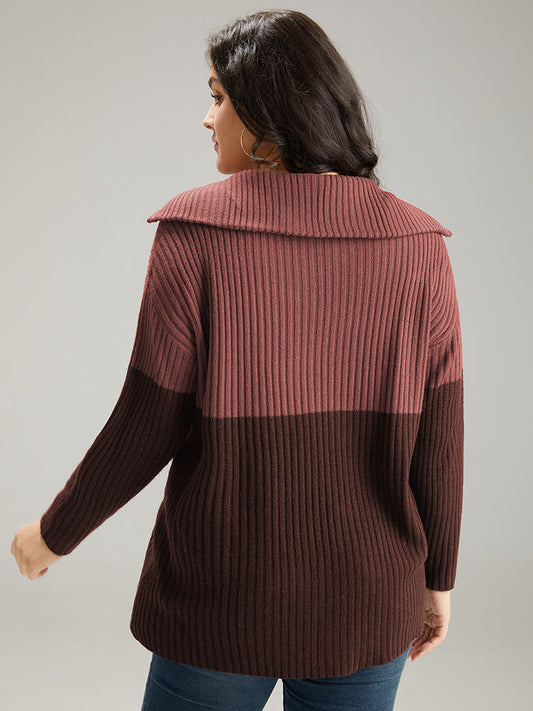 Colorblock Contrast Half Zip Lapel Collar Pullover