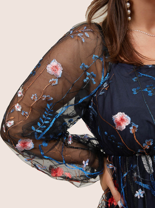 Square Neck Embroidered Lace Mesh Lantern Sleeve Dress