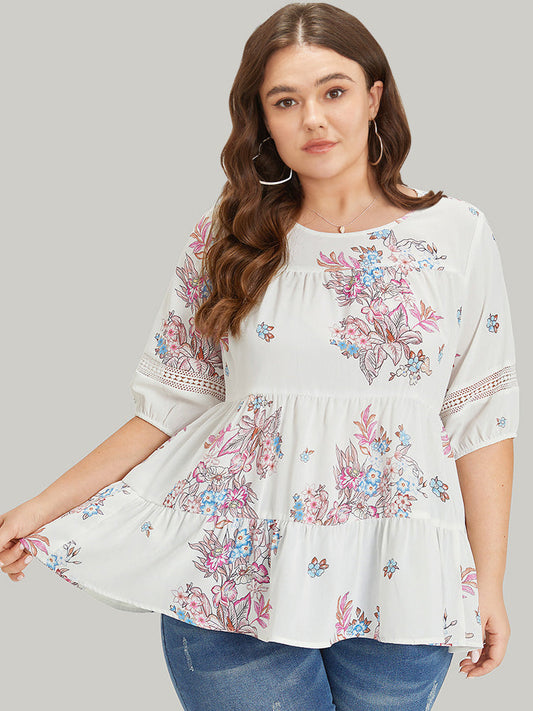 Floral Print Patchwork Ruffle Layered Hem Lantern Sleeve Blouse