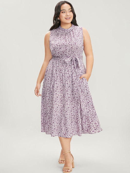 Ditsy Floral Keyhole Pocket Belted Mock Neck Ruffles Dress