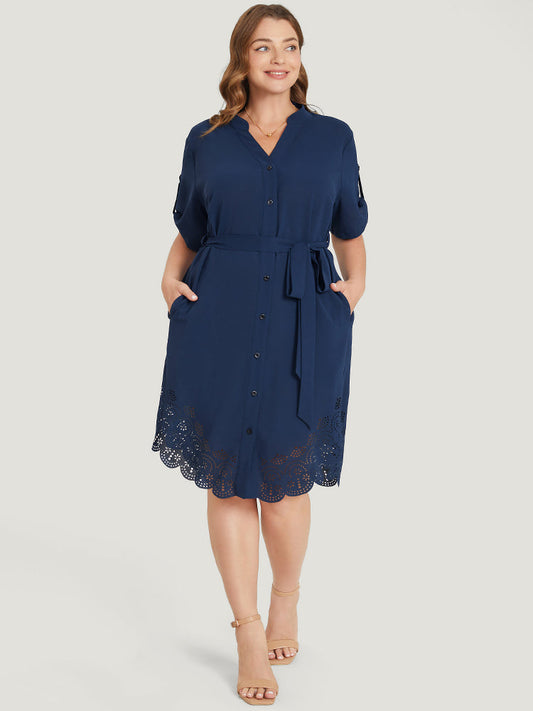 Solid Cuffed Sleeve Button Up Belted Laser Cut Arc Hem Dress