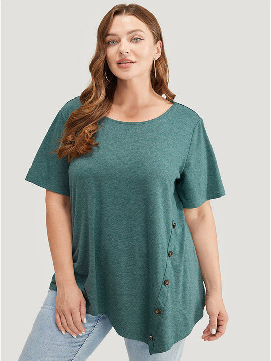 Solid Asymmetrical Hem Button Detail Ruffles T-shirt