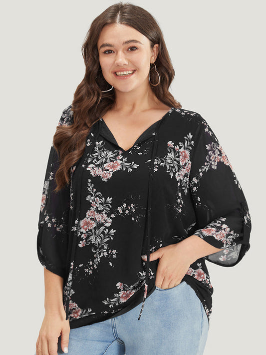 Floral Print Knot Neck Mesh Tab Sleeve Blouse