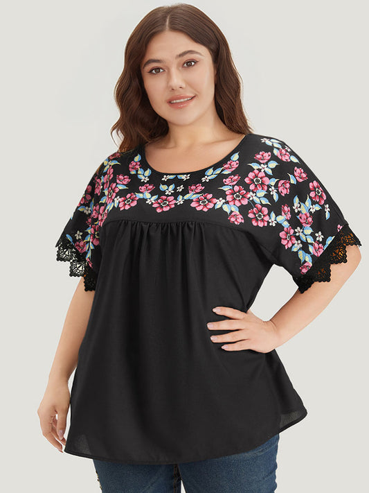 Floral Print Patchwork Lace Trim Gathered Blouse