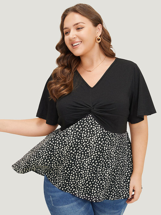 Leopard Patchwork Twist Ruffle Sleeve Blouse