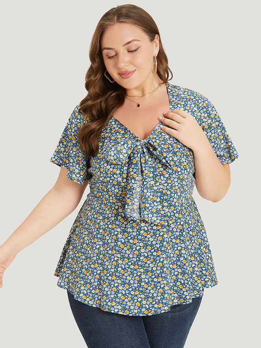 Ditsy Floral V Neck Ruffle Tie Front Blouse