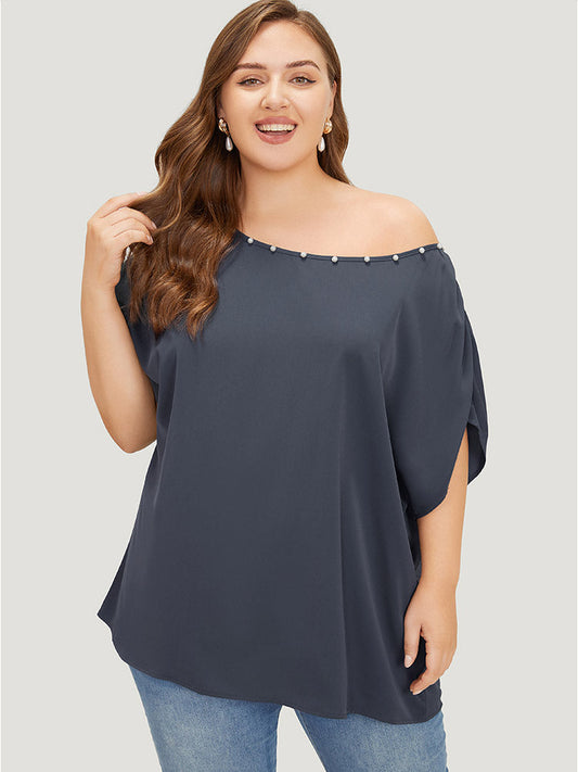 Solid Pearl Beaded Ruched Sleeve Blouse