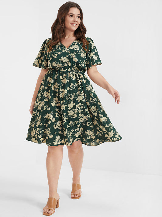 Floral Pocket Keyhole Lace Cap Sleeve Flutter Dress