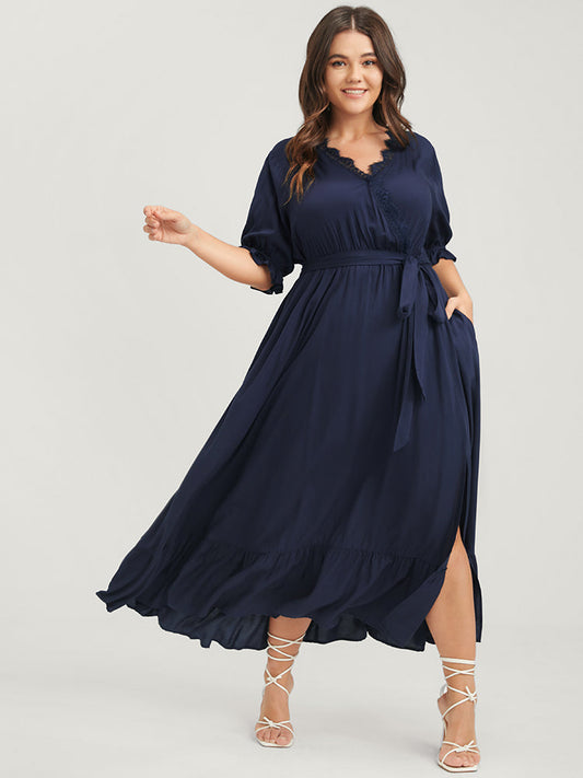 Solid Knotted Pocket Lace Trim Wrap Maxi Dress