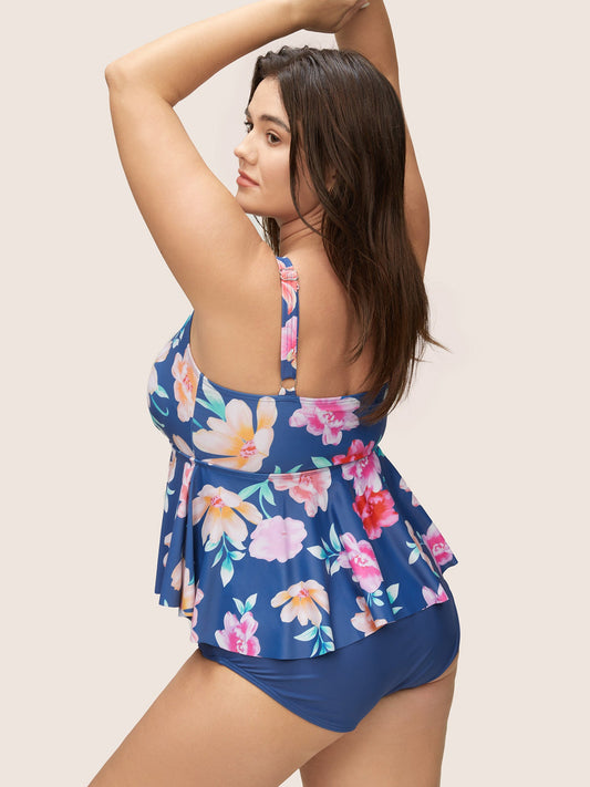 Floral Ruffle Hem Adjustable Straps One Piece Swimsuit