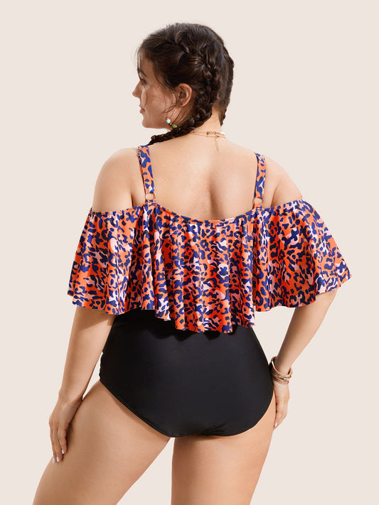 Leopard Patchwork Cold Shoulder One Piece Swimsuit
