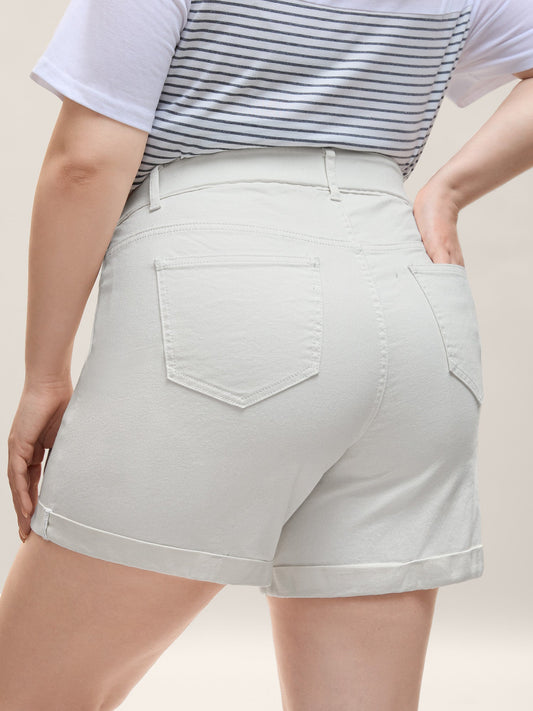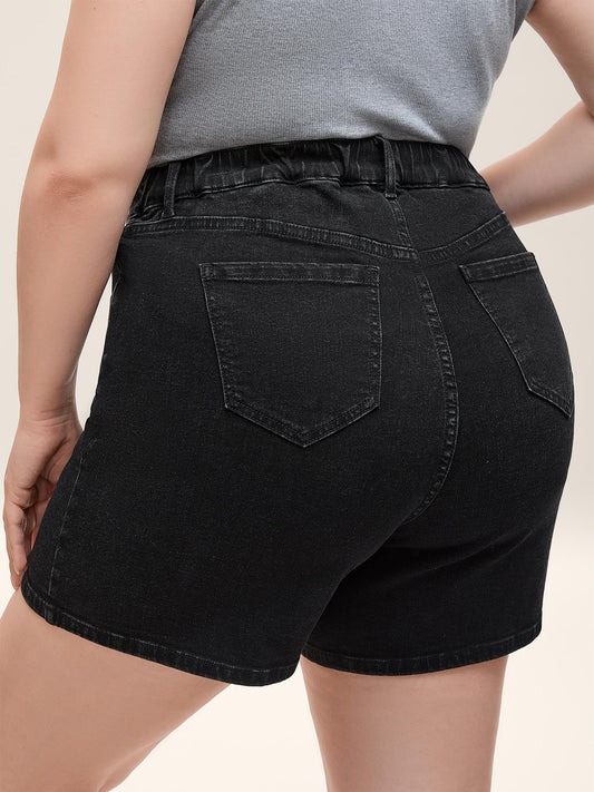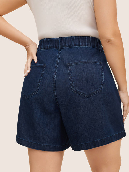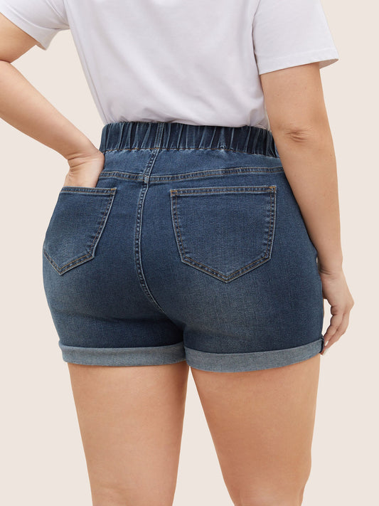 Dark Wash Elastic Waist Roll Hem Denim Shorts