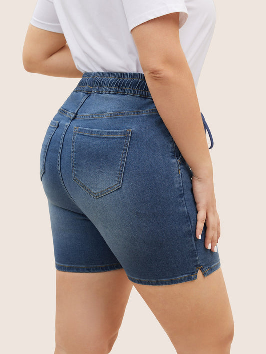 Light Wash Slit Hem Elastic Waist Denim Shorts