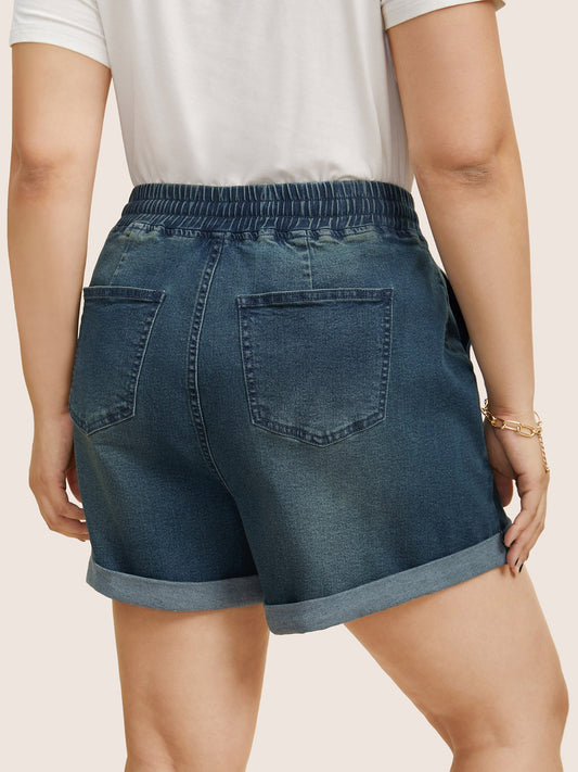 Dark Wash Roll Hem Drawstring Denim Shorts