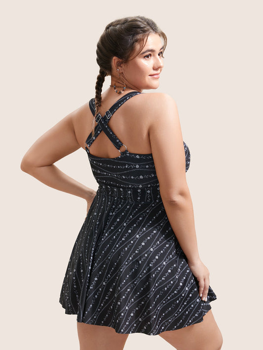 Ditsy Floral & Geo Graphic Crossover Swim Dress