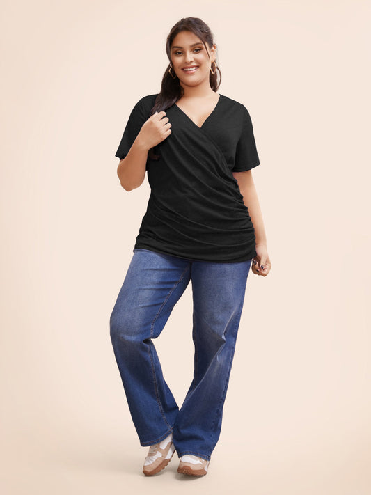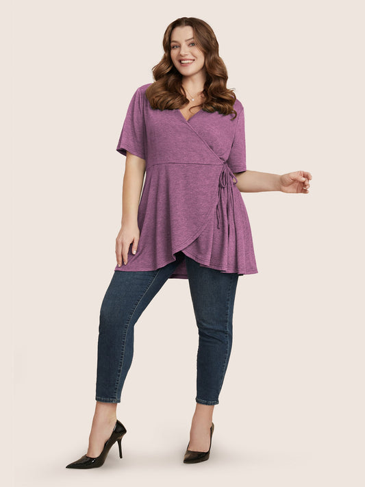 Plain Surplice Neck Tie Side Asymmetrical Hem T-shirt