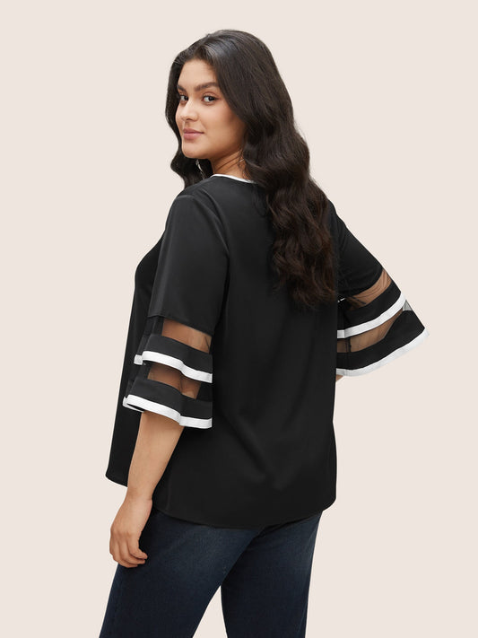 Contrast Patchwork Mesh Bell Sleeve Blouse