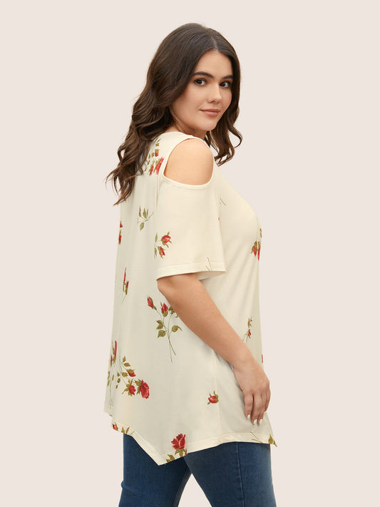 • Solid Cold Shoulder Ruffle Trim T-shirt