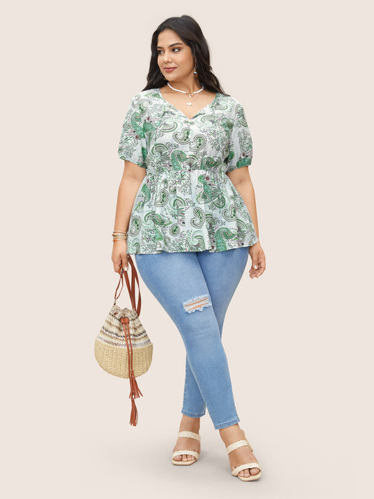 • Contrast Patchwork Mesh Bell Sleeve Blouse