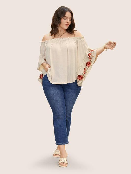 • Off Shoulder Floral Embroidered Ruffle Sleeve T-shirt