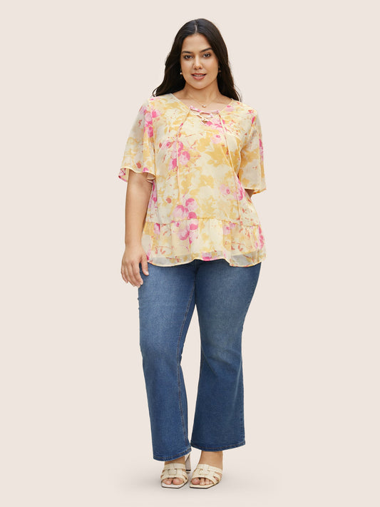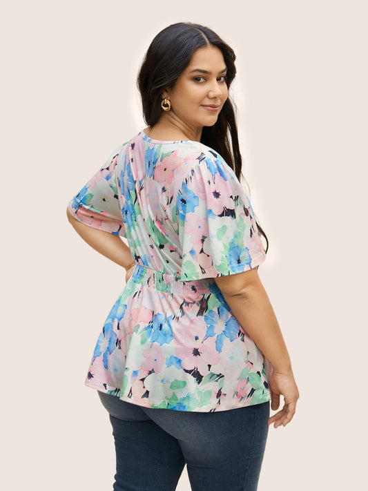 V Neck Floral Shirred Flutter Sleeve T-shirt