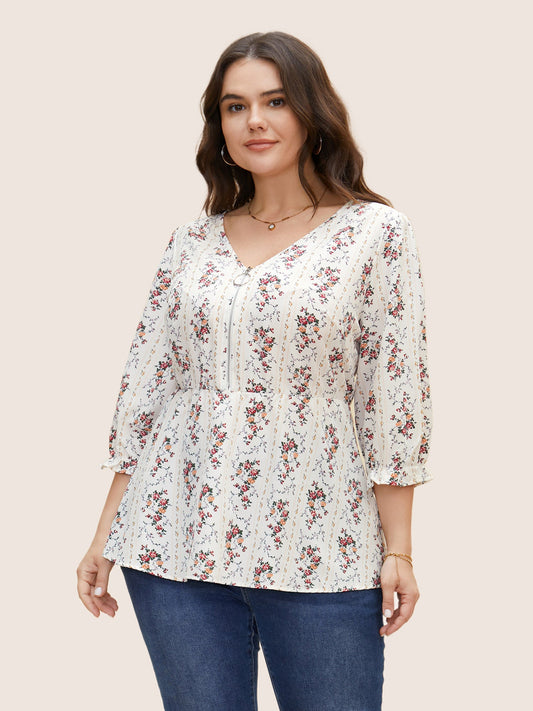 Boho Print O Ring Zipper Lantern Sleeve Blouse