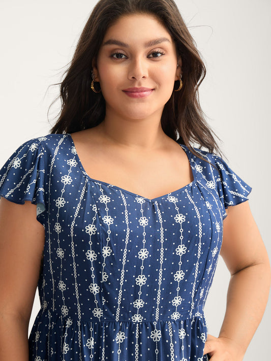 Plaid Frill Trim Bell Sleeve Flutter Hem Blouse