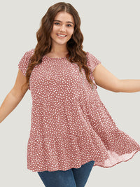 Allover Print Cap Sleeve Ruffle Hem Gathered Blouse