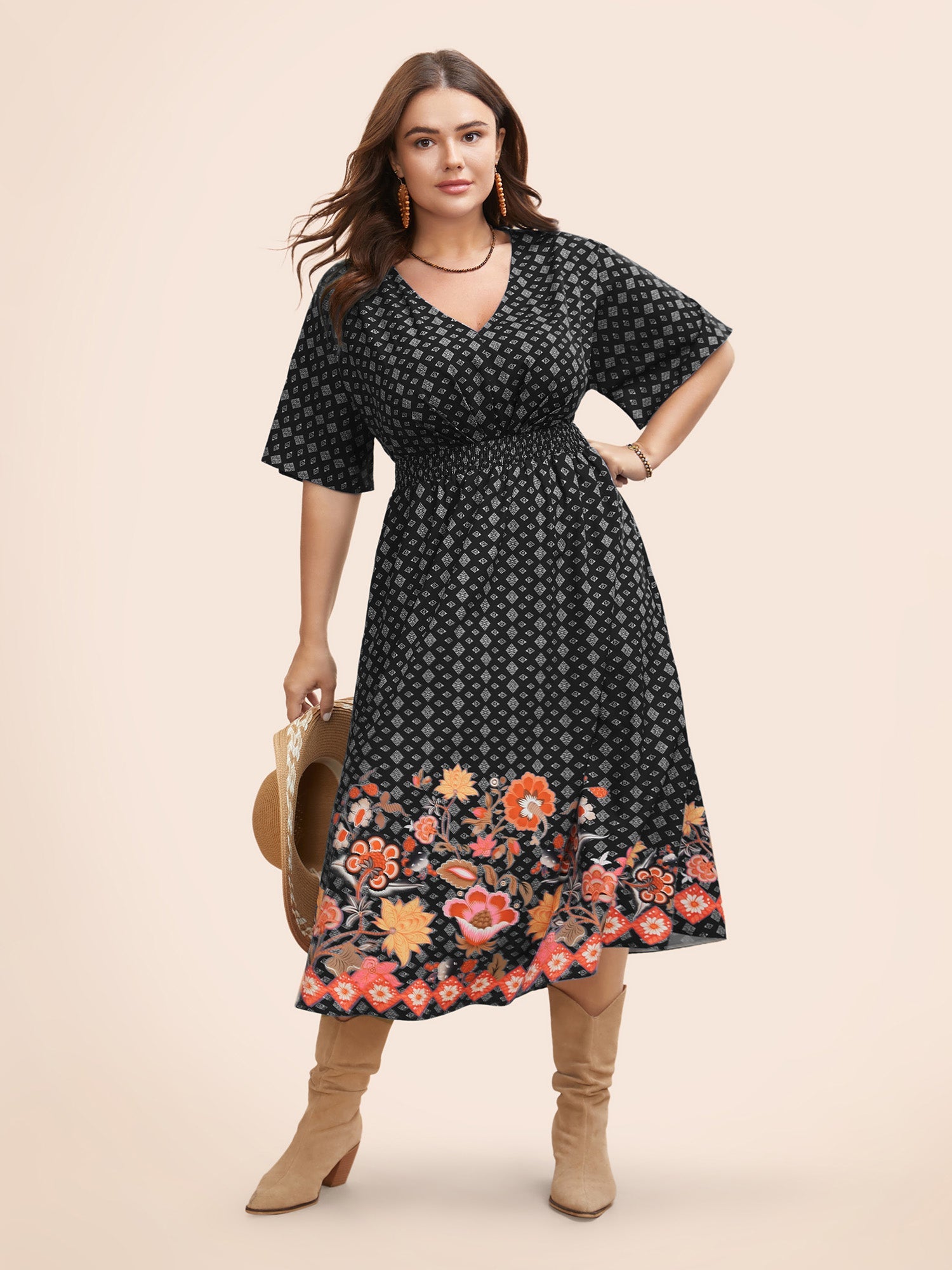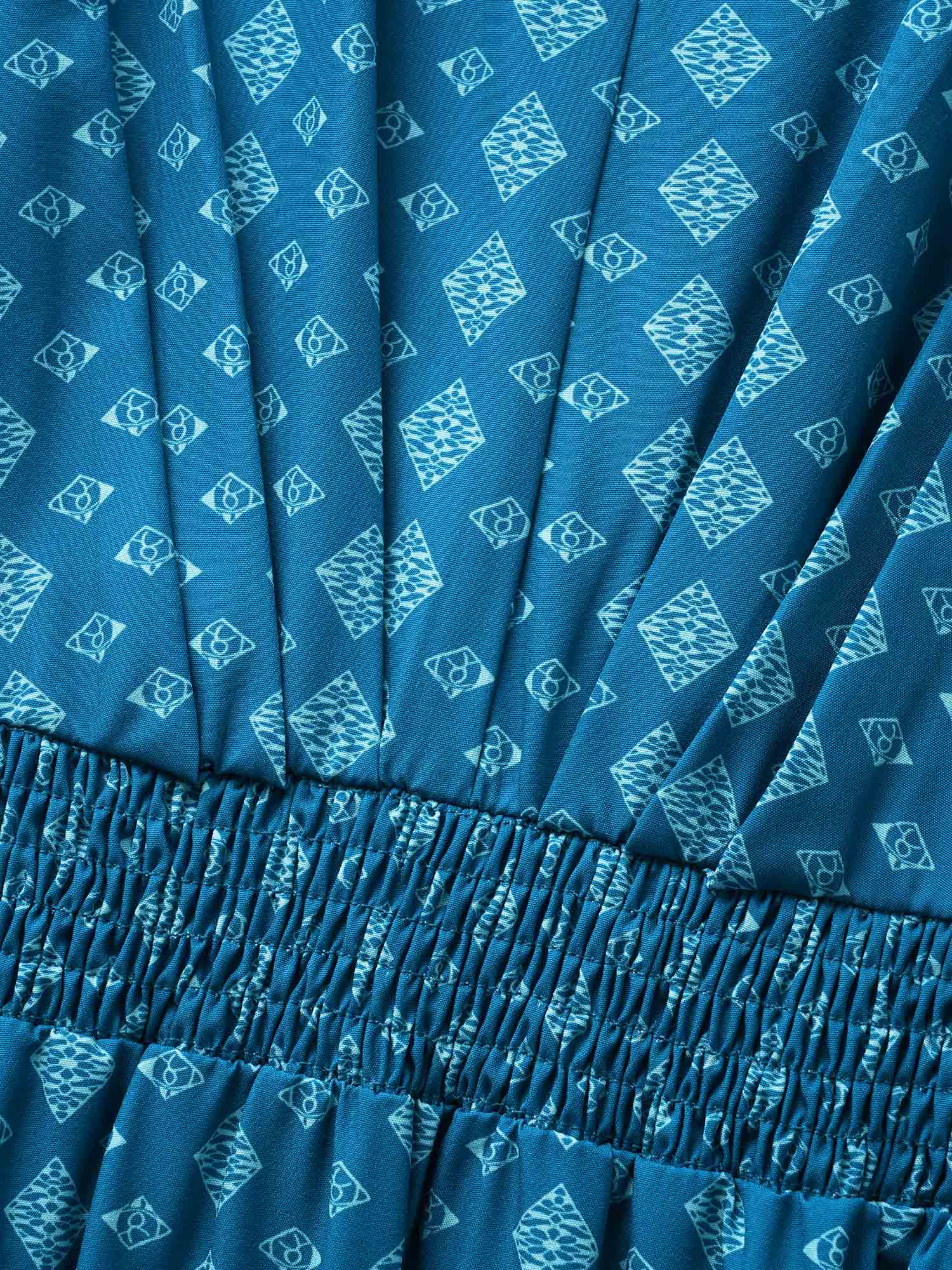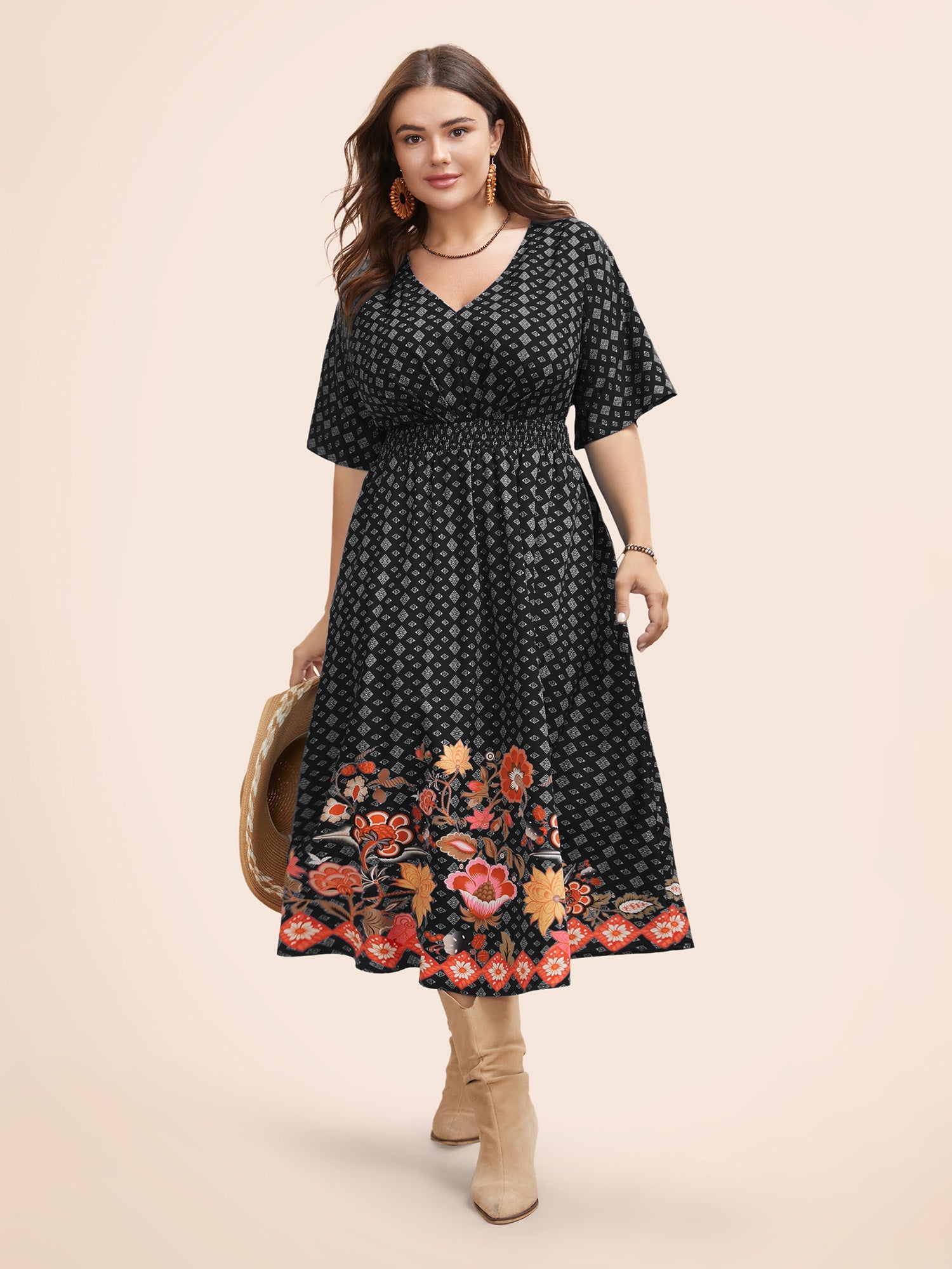 Boho Print Shirred Pleated Dolman Sleeve Dress