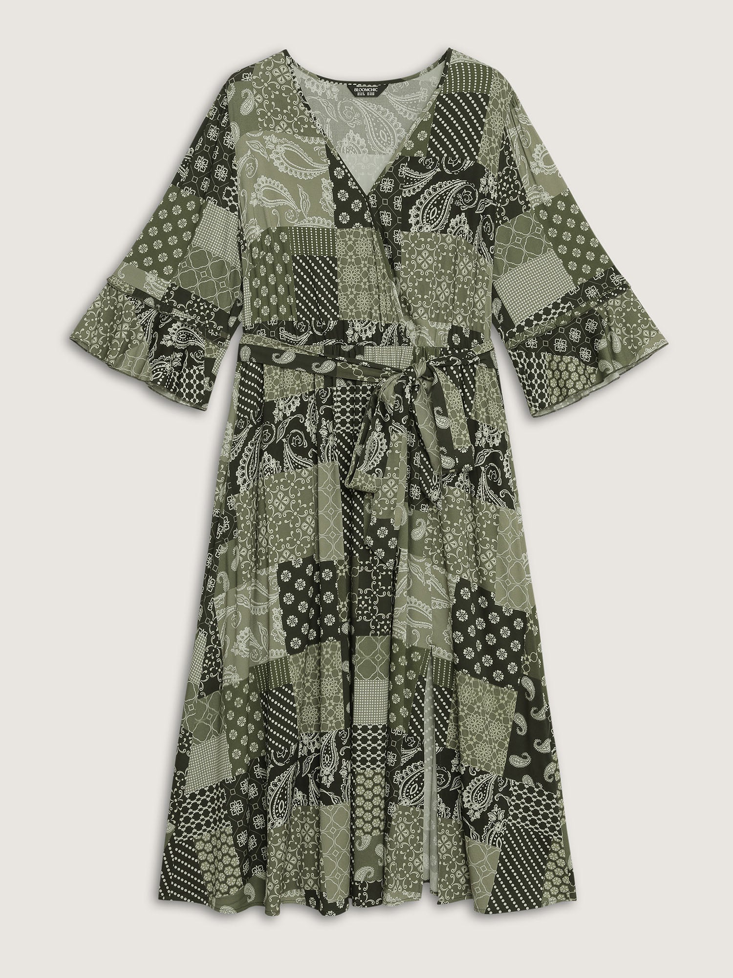 Boho Print Wrap Neckline Belted Maxi Dress