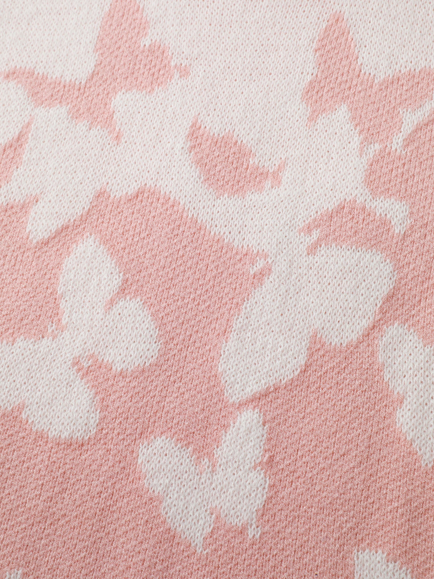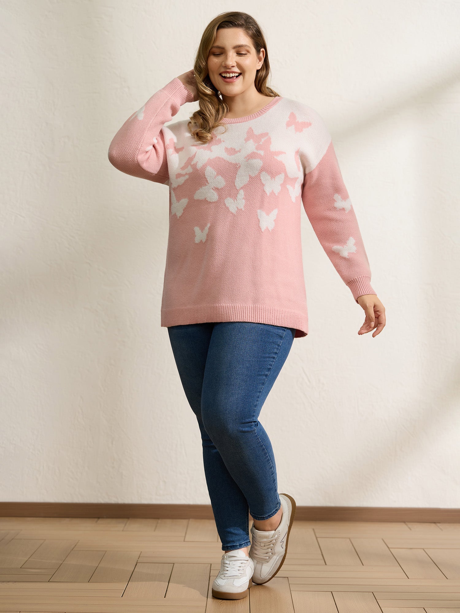 Butterfly Jacquard Pattern Ribbed Hem Pullover