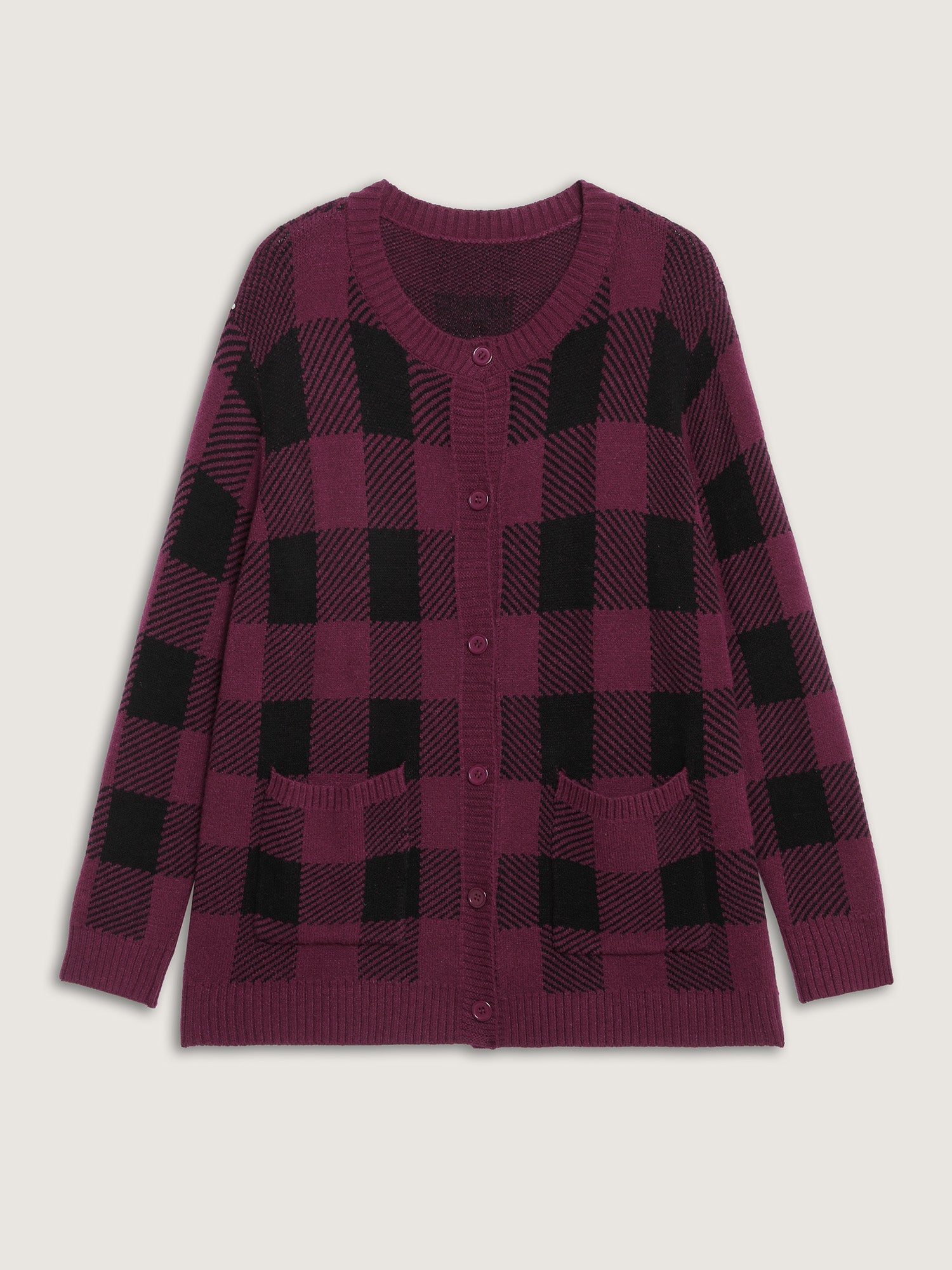 Checkered Jacquard Buttons Pockets Knit Cardigan