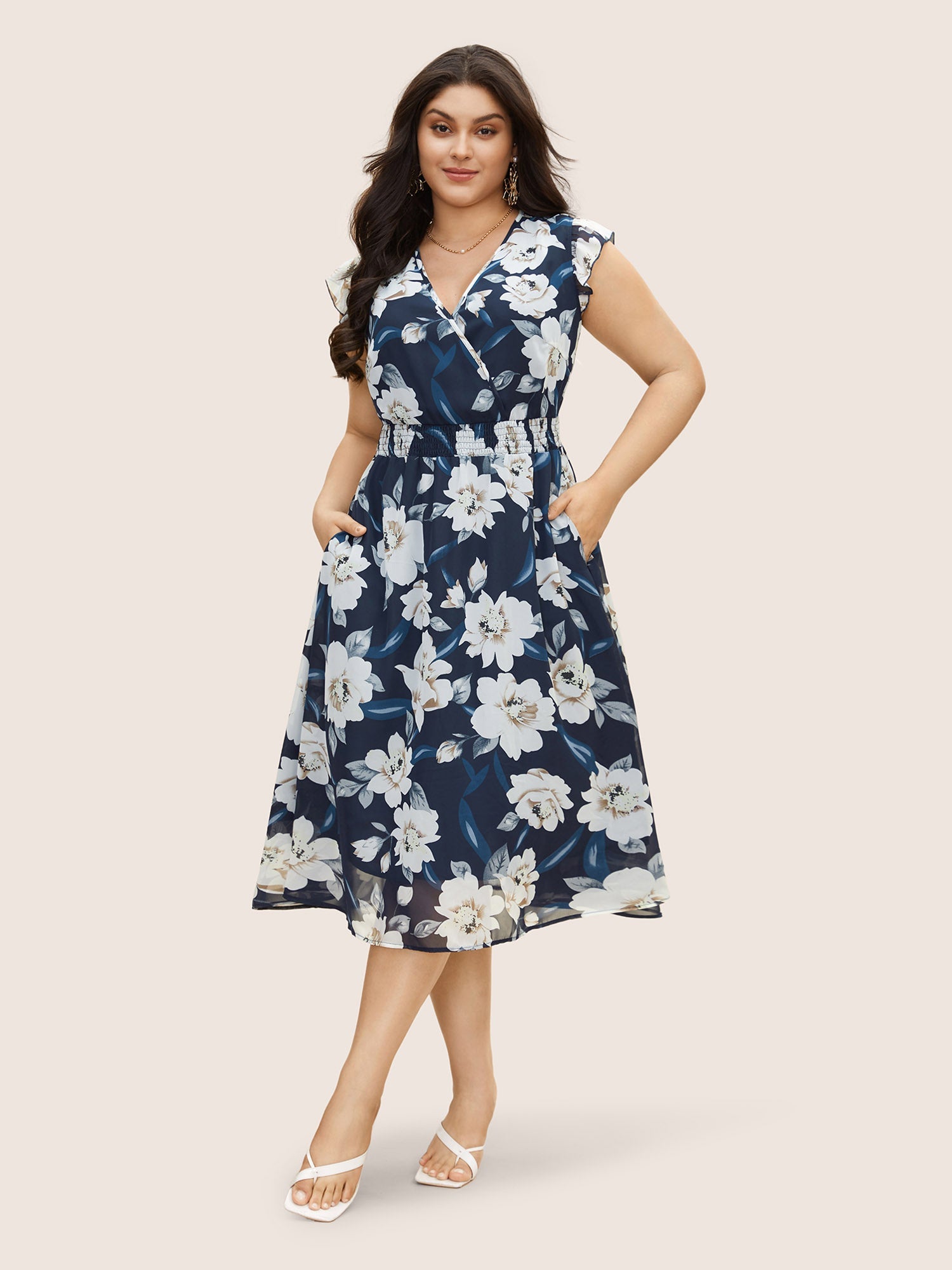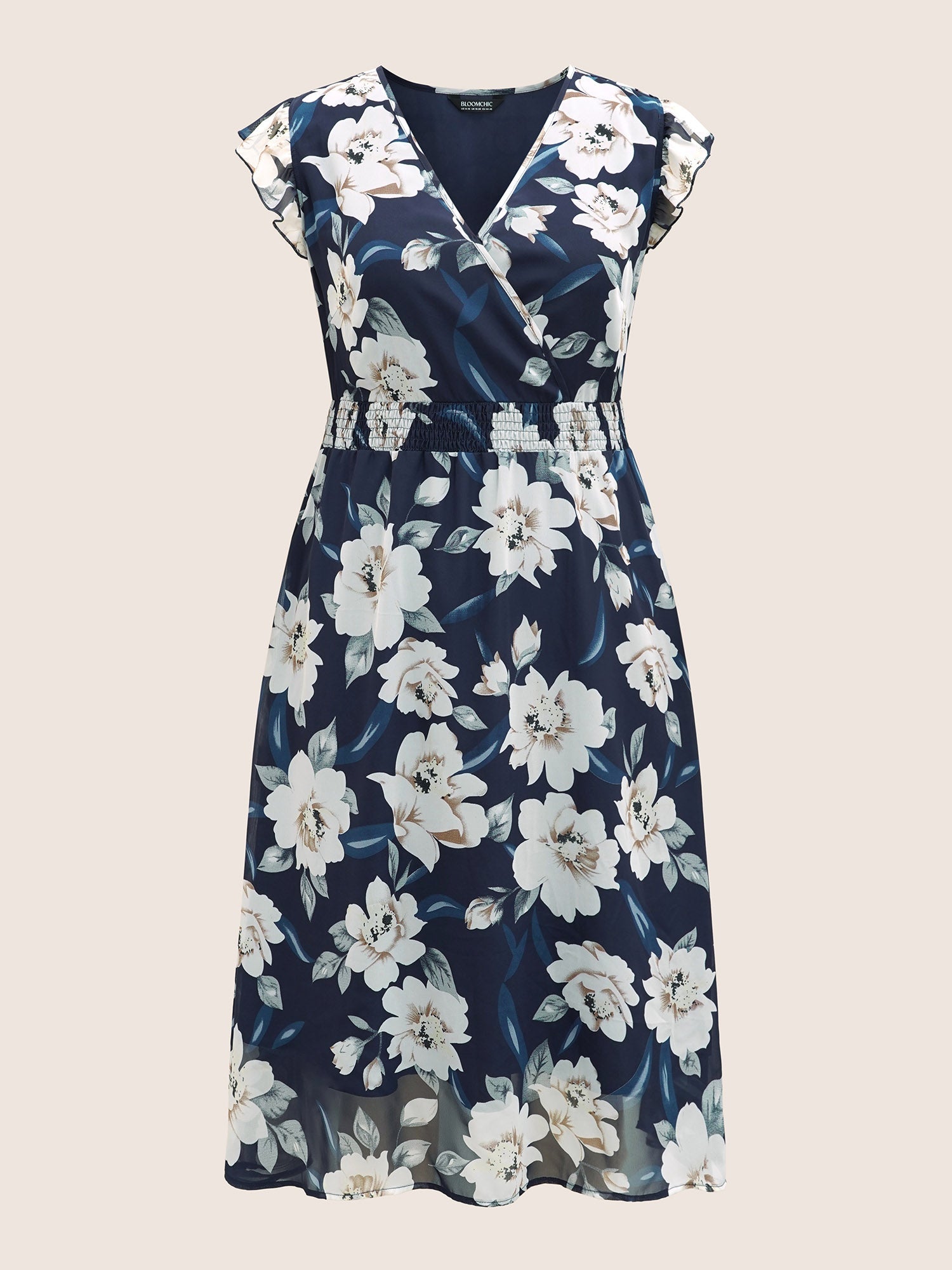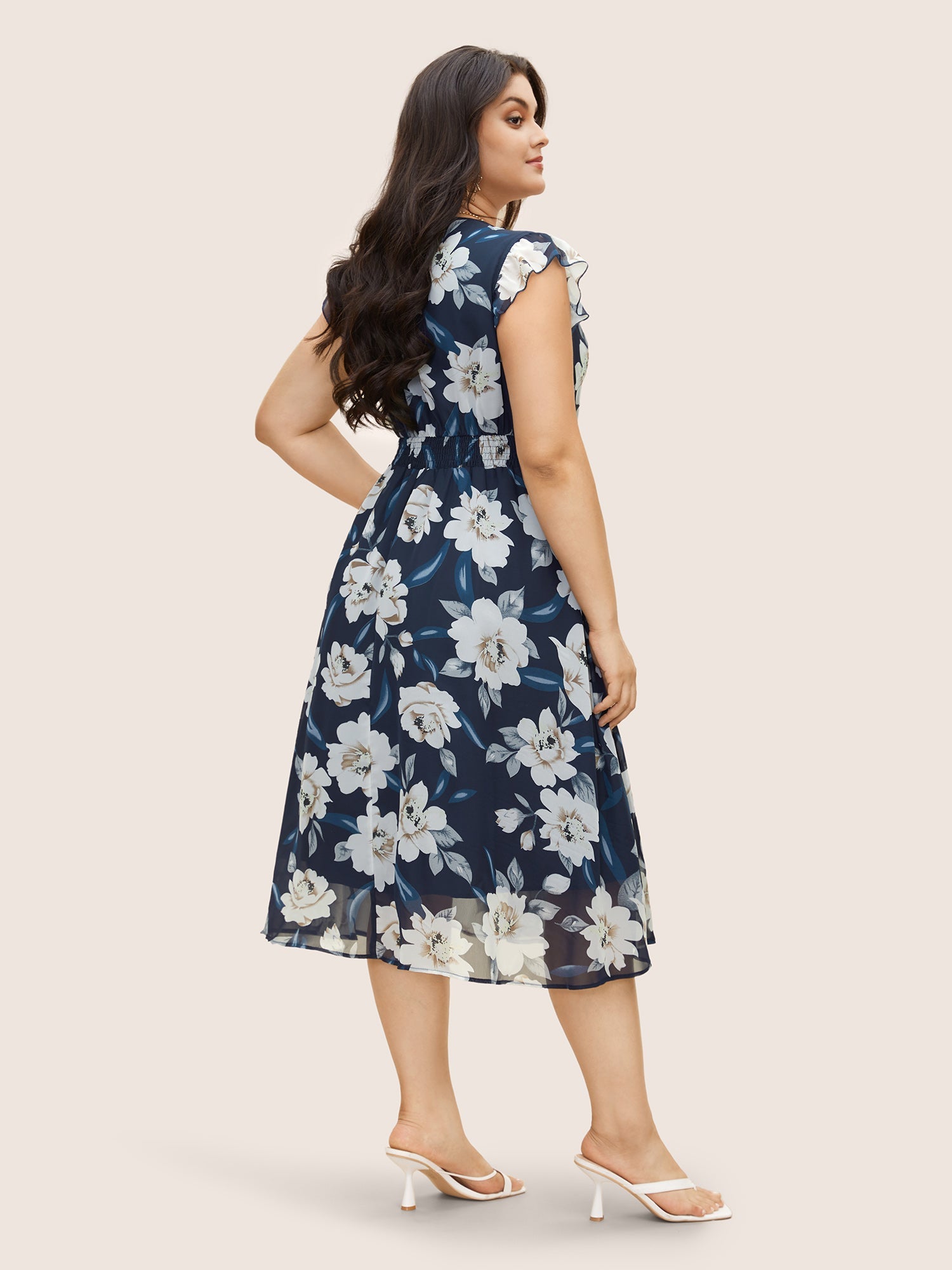 Chiffon Floral Ruffle Cap Sleeve Dress