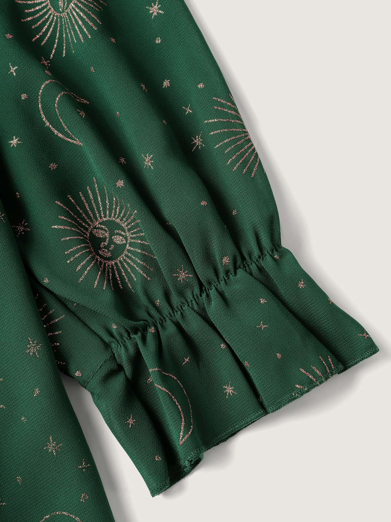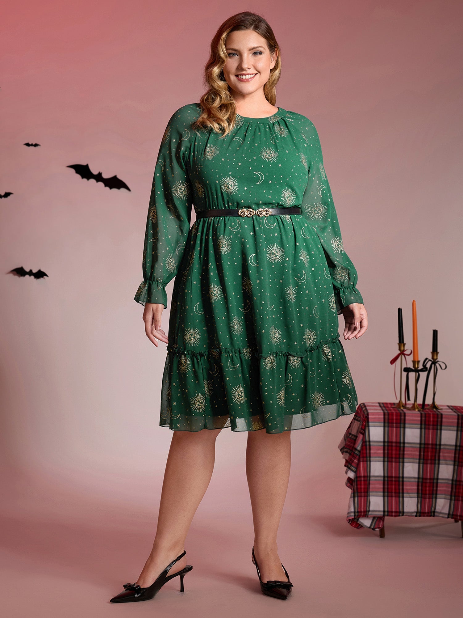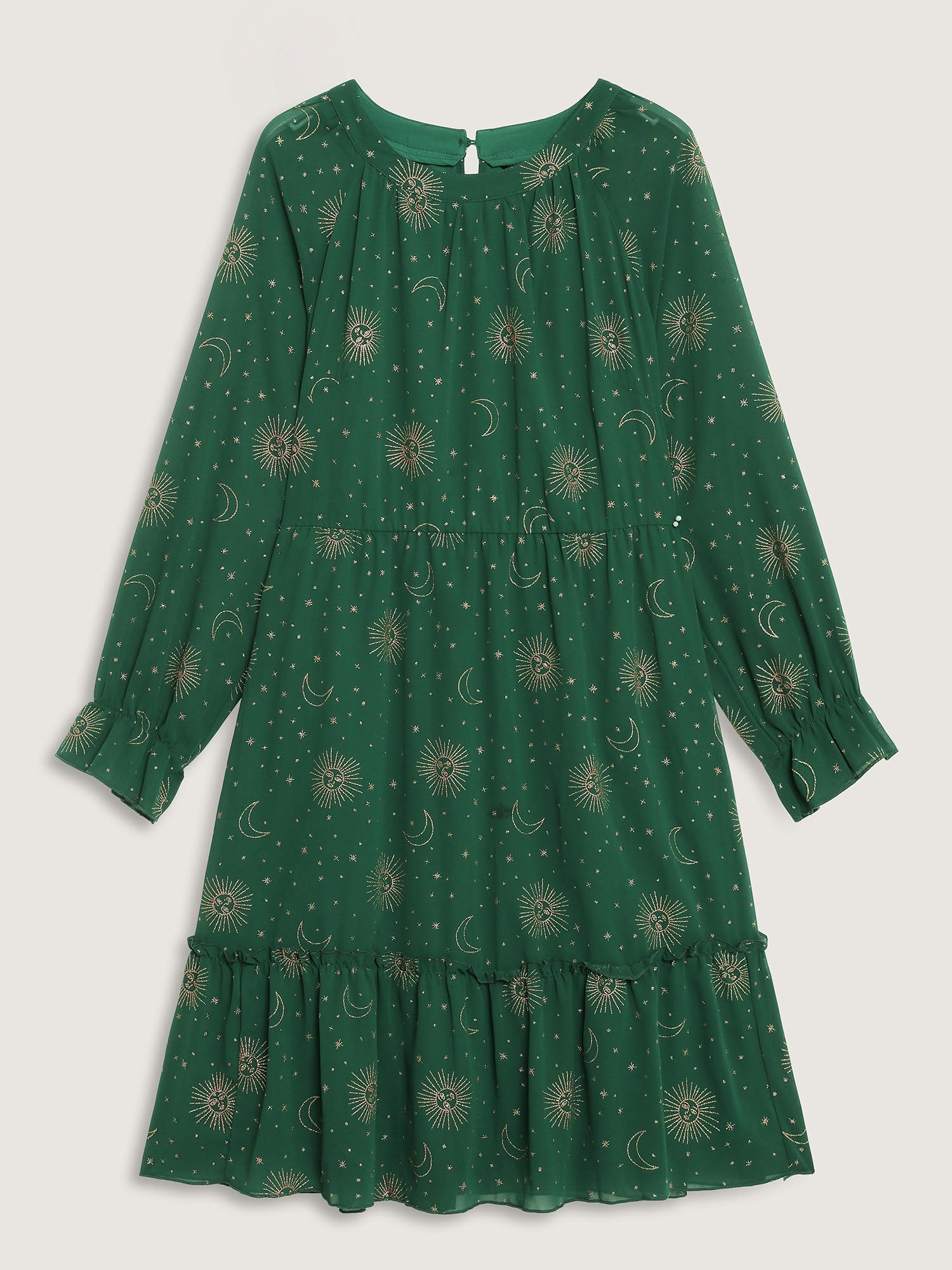 Chiffon Gold Celestial Print Tiered Midi Dress