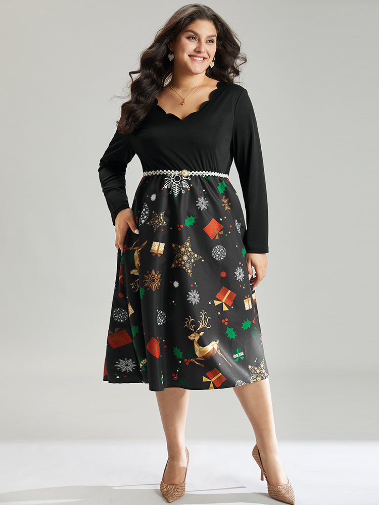Christmas Print Patchwork Scalloped Trim Elastic Waist Dress