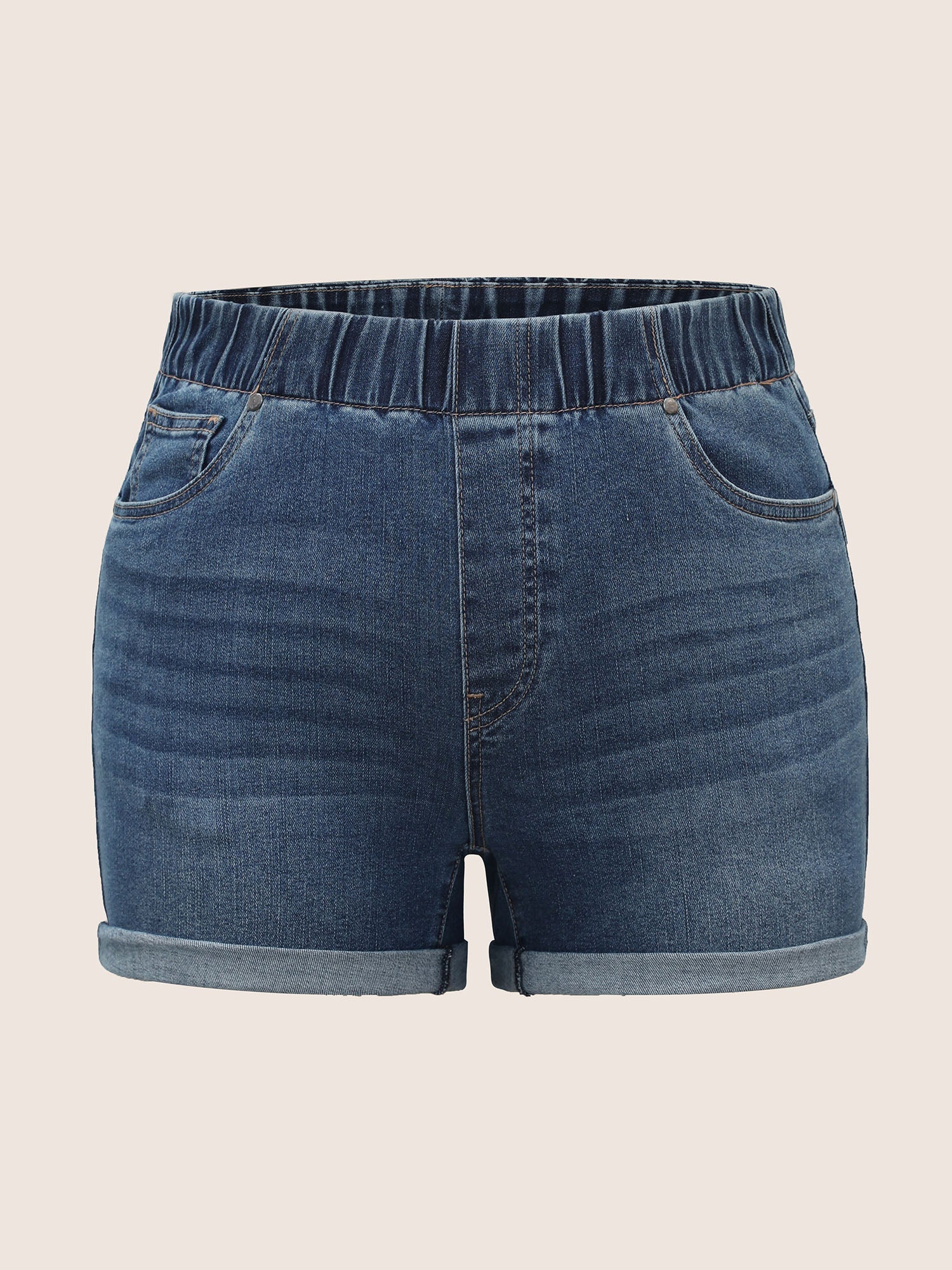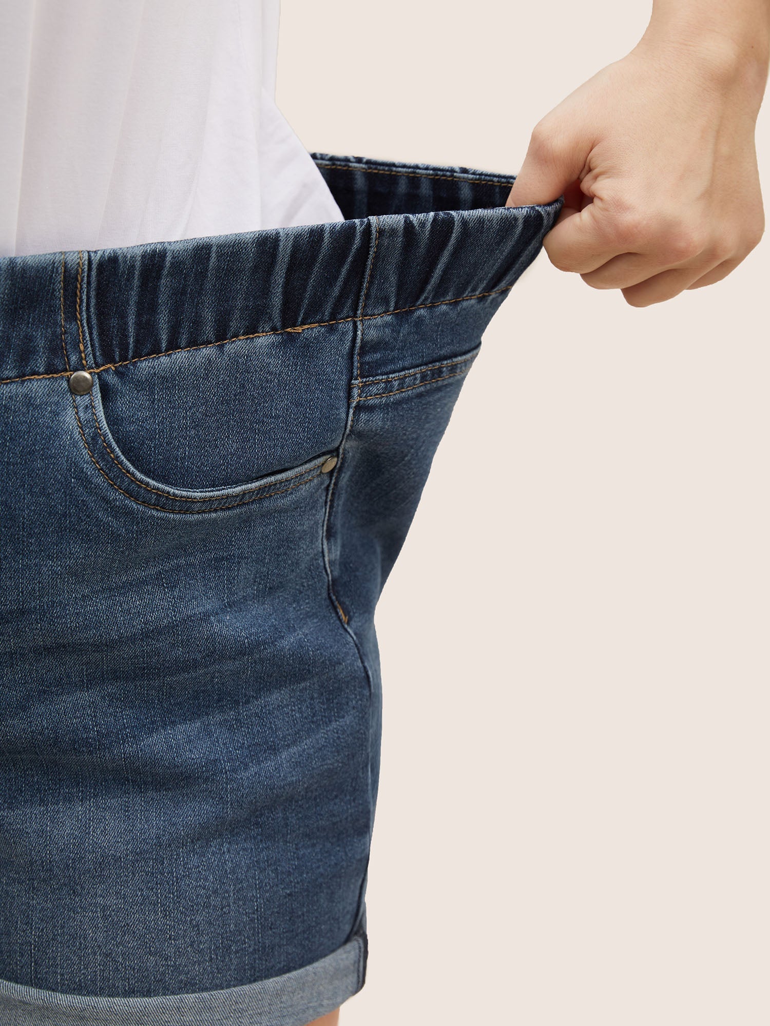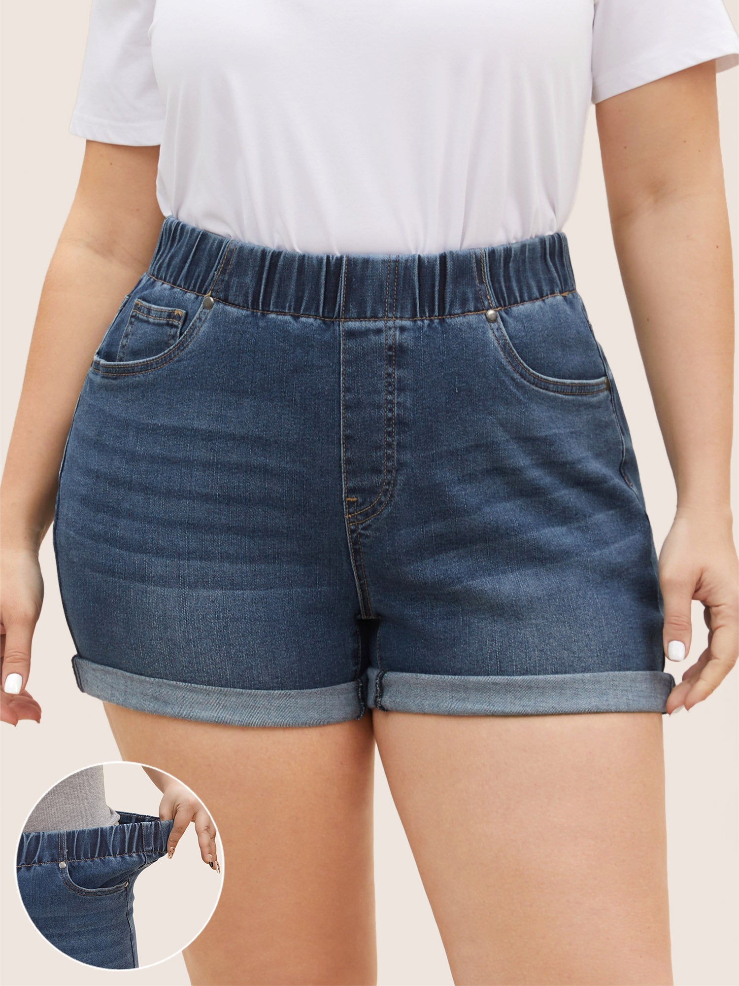 Dark Wash Elastic Waist Roll Hem Denim Shorts