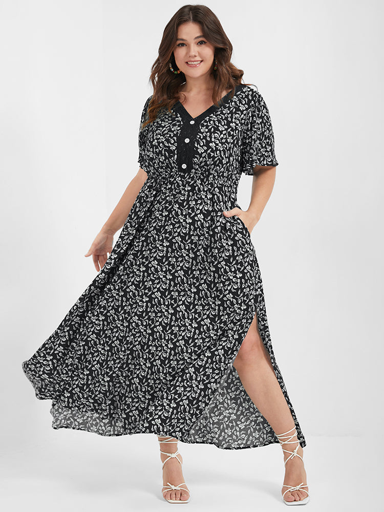 Ditsy Floral Button Lace Pocket Split Ruffles Maxi Dress