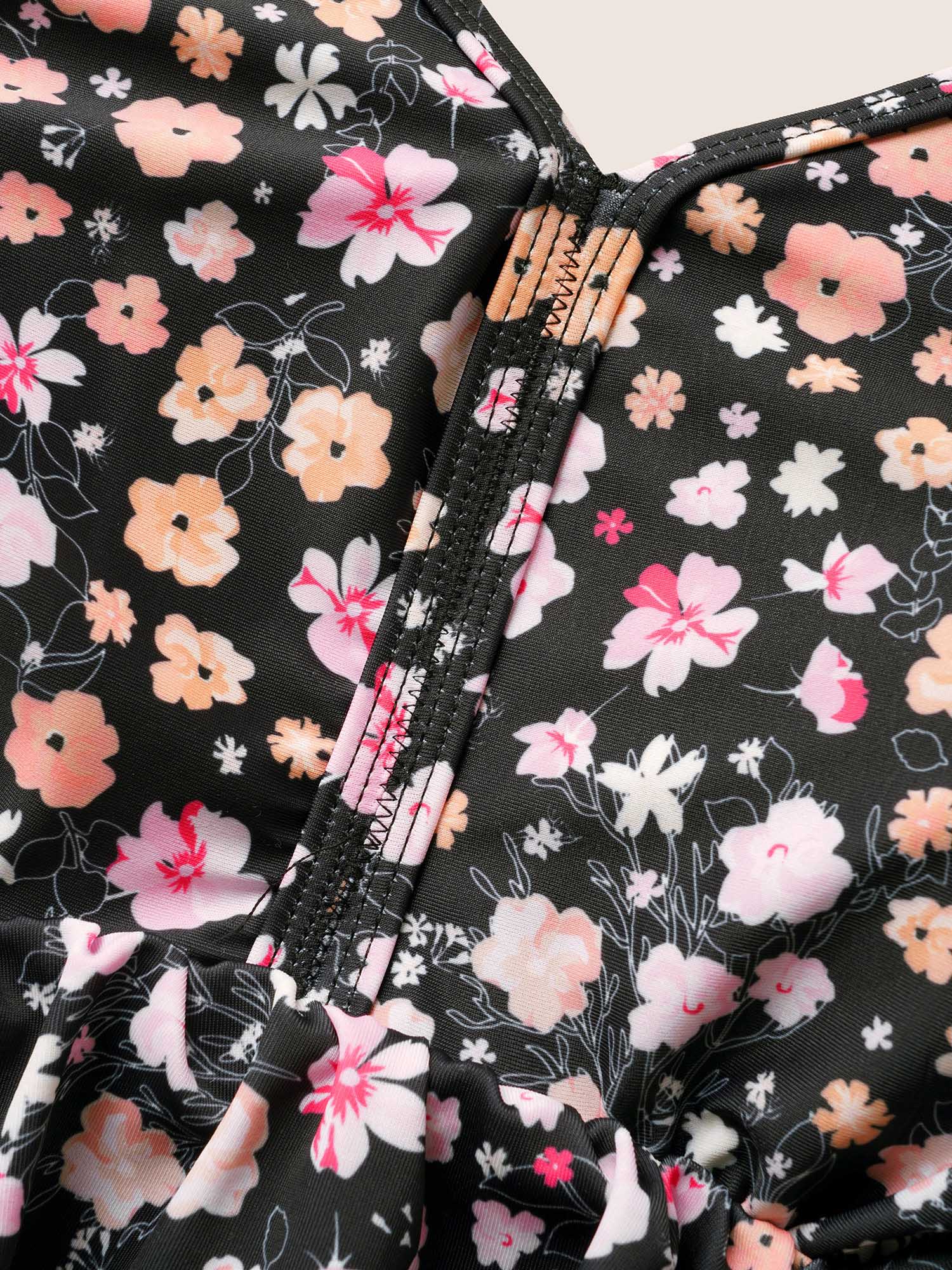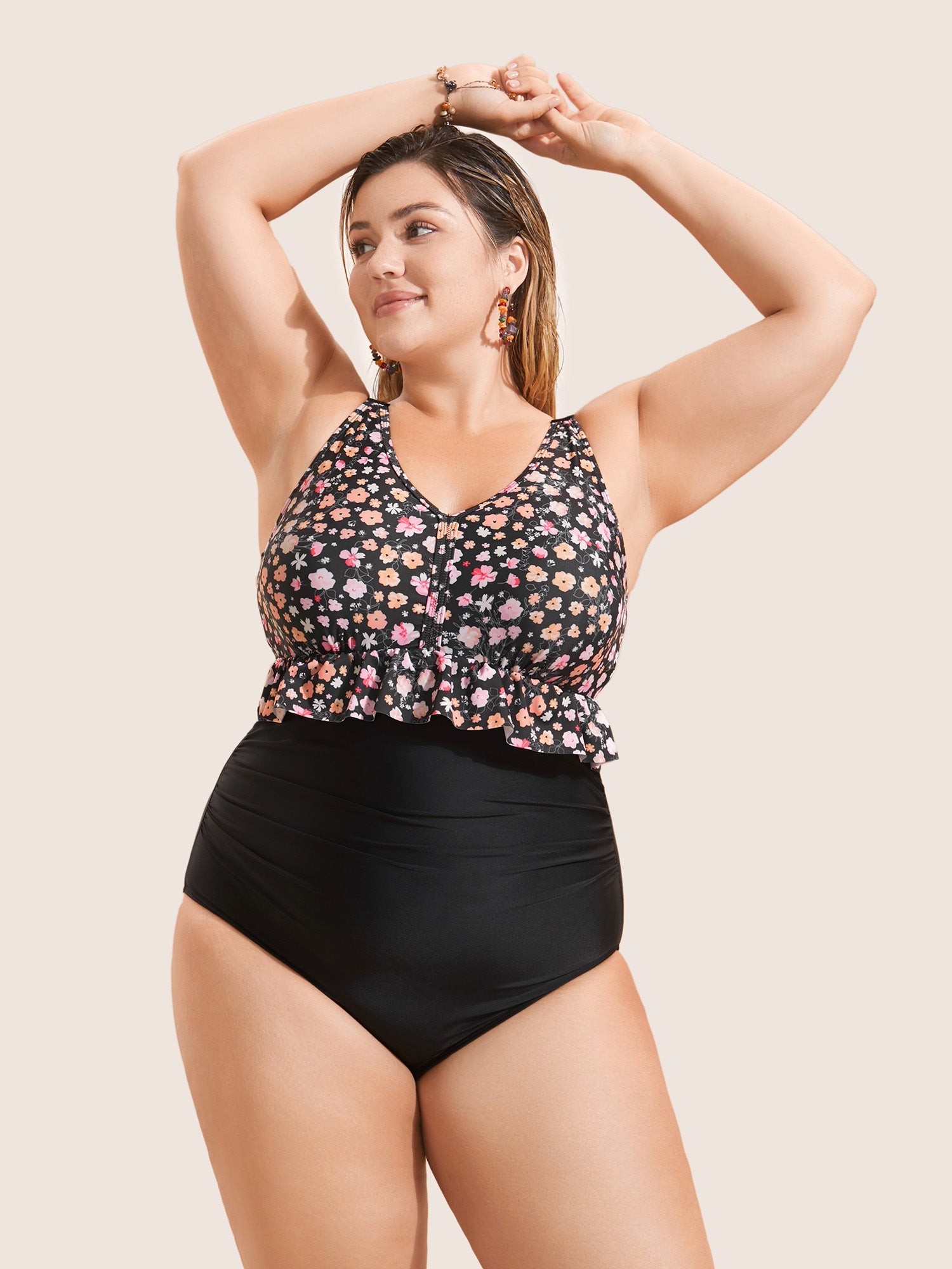 Ditsy Floral Patchwork Ruffle Trim One Piece Swimsuit