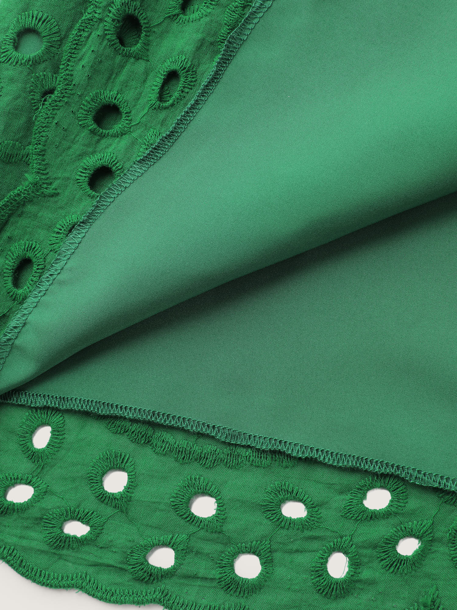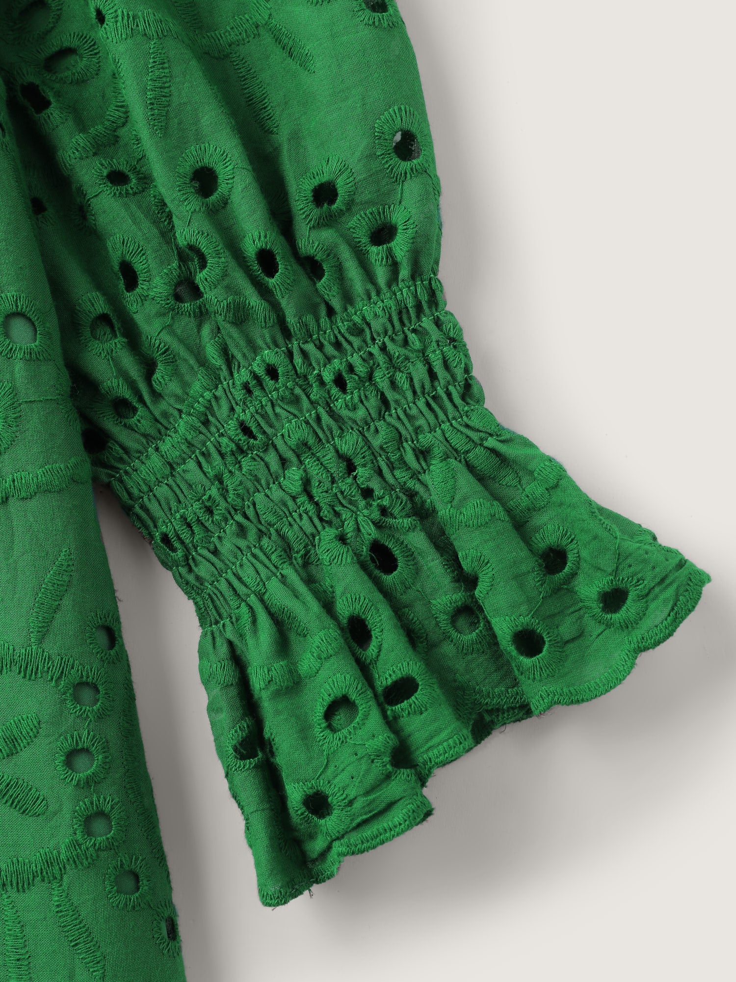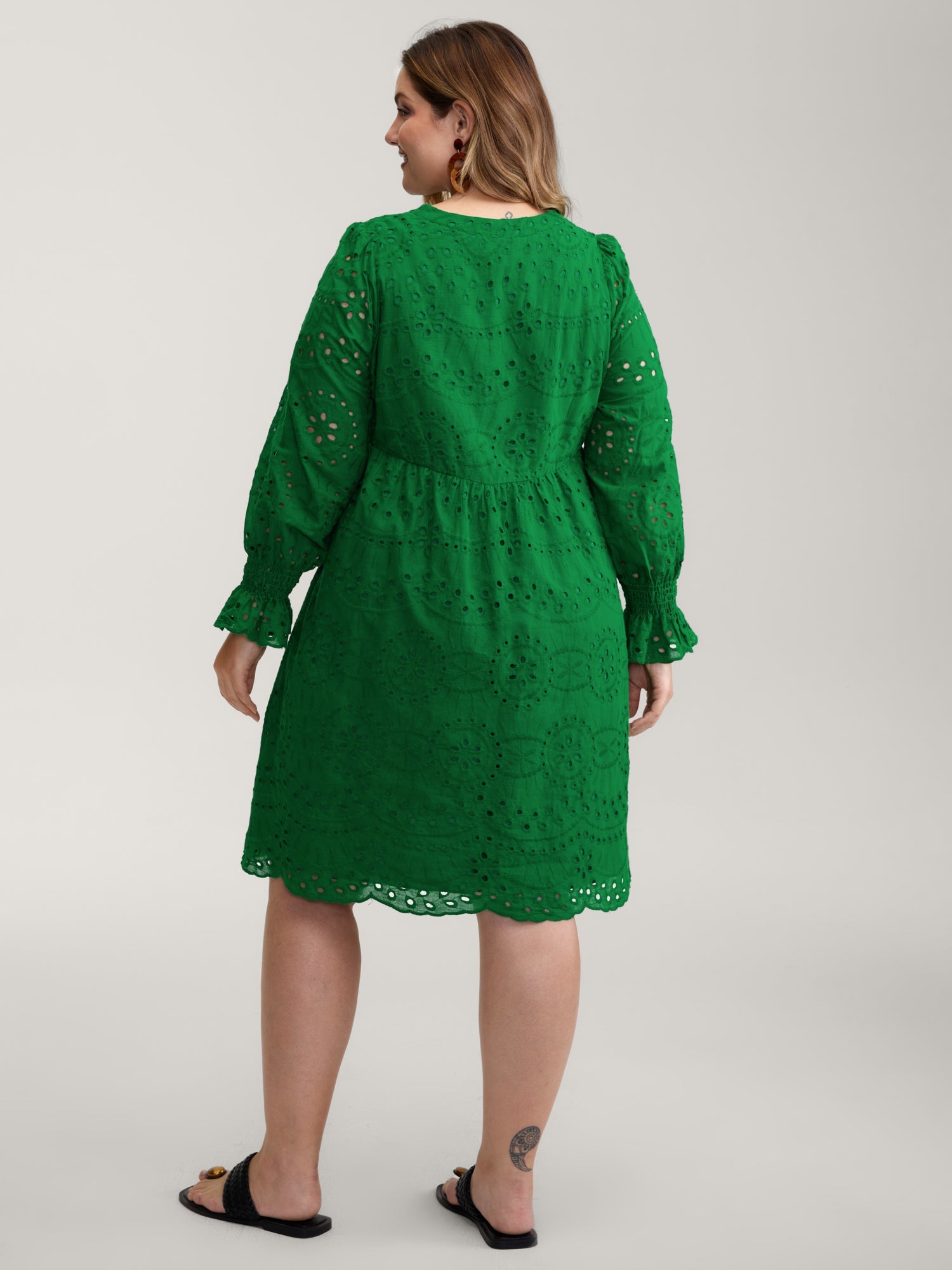 Eyelet Embroidery Shirred Cuffs Midi Dress