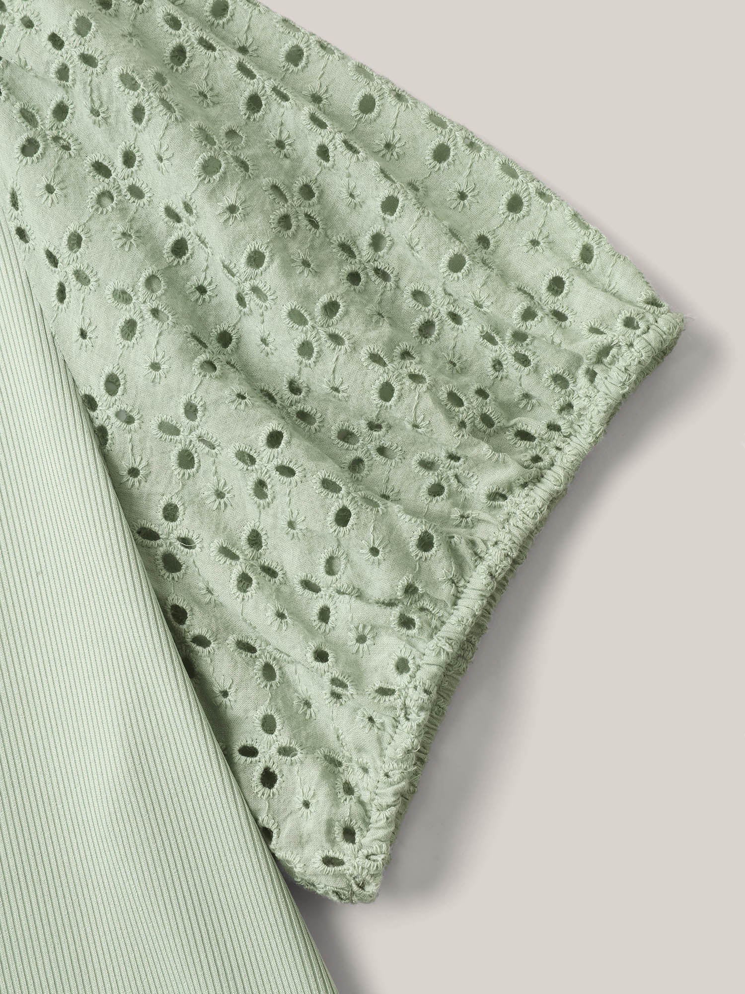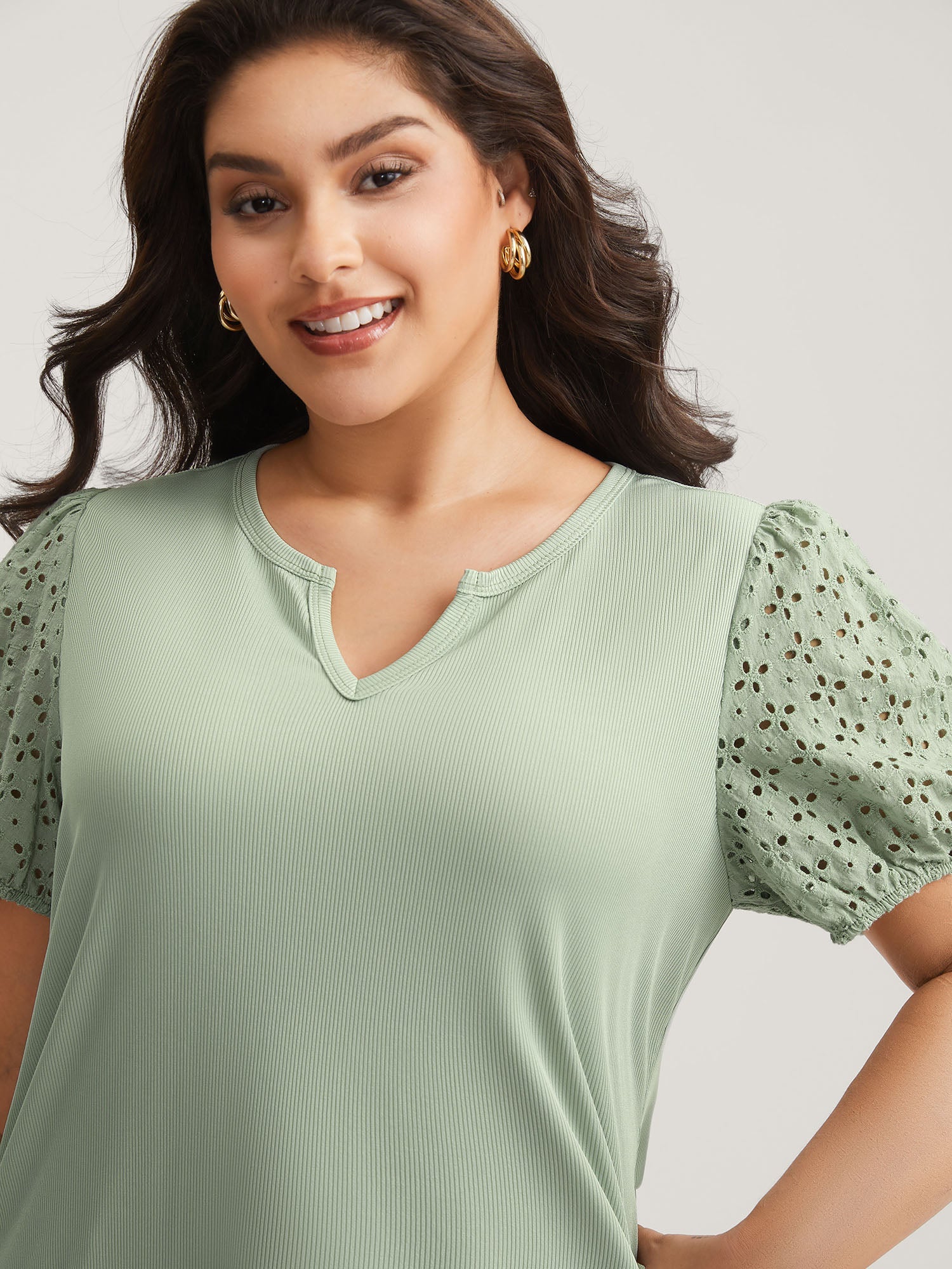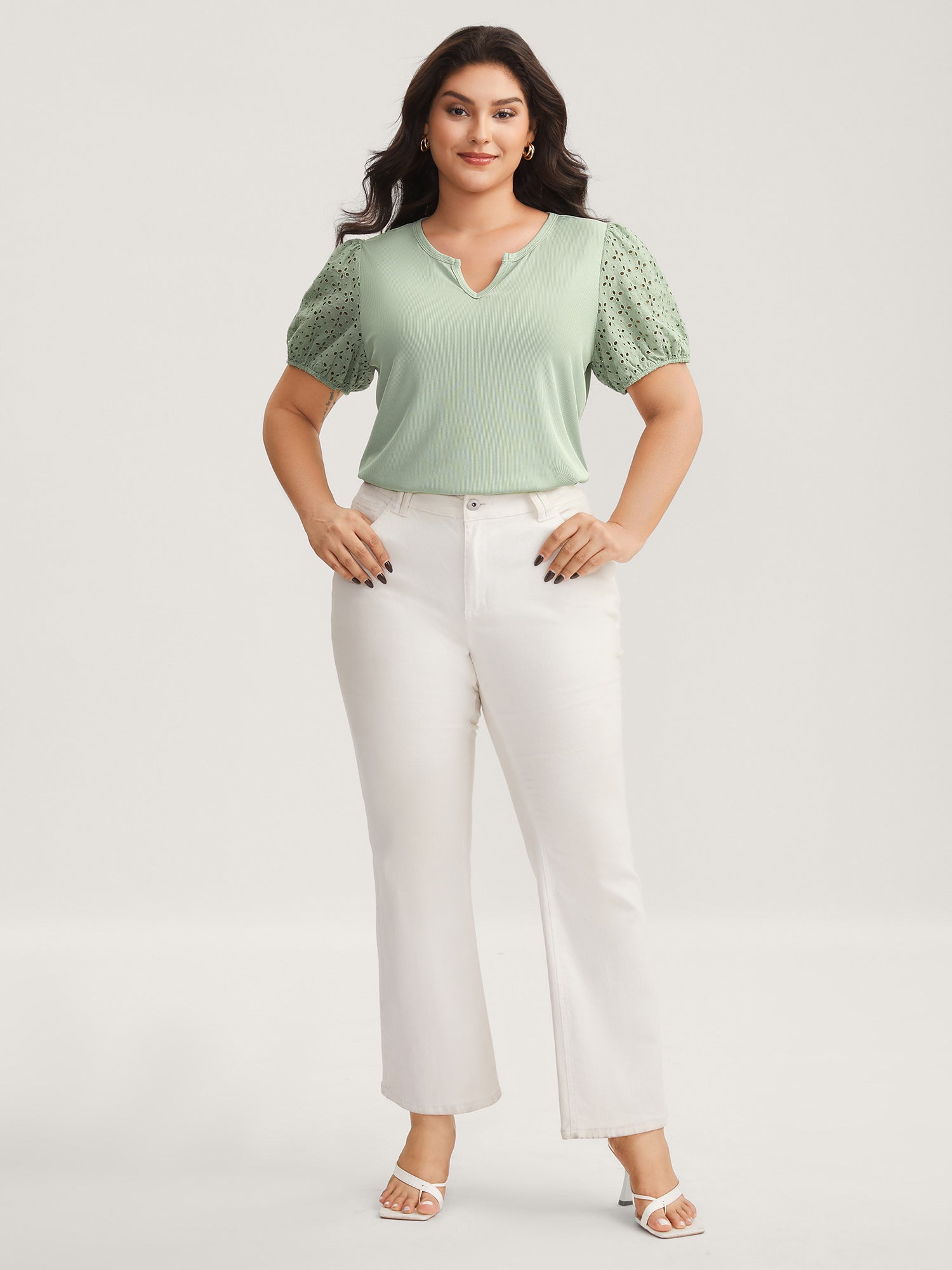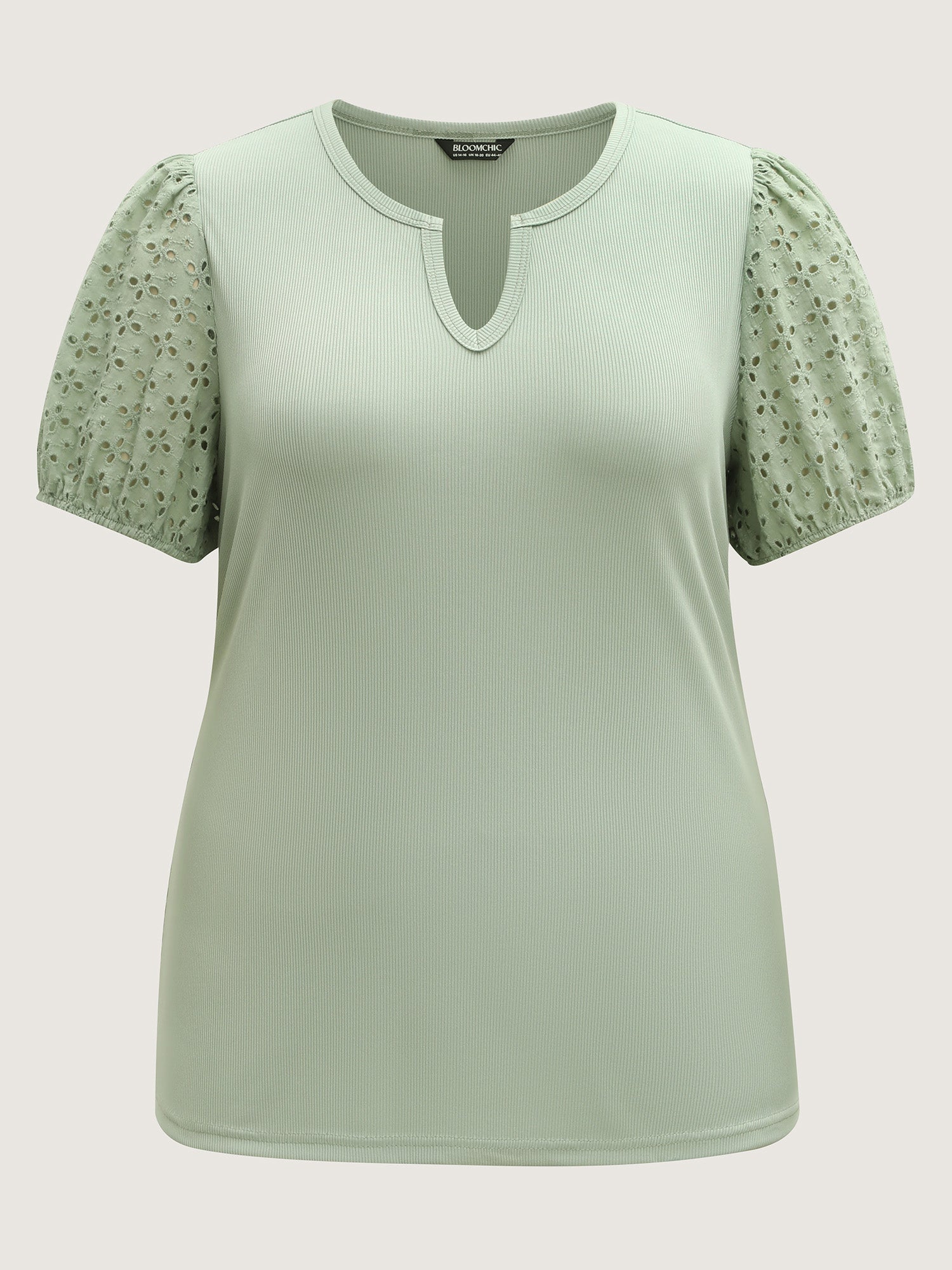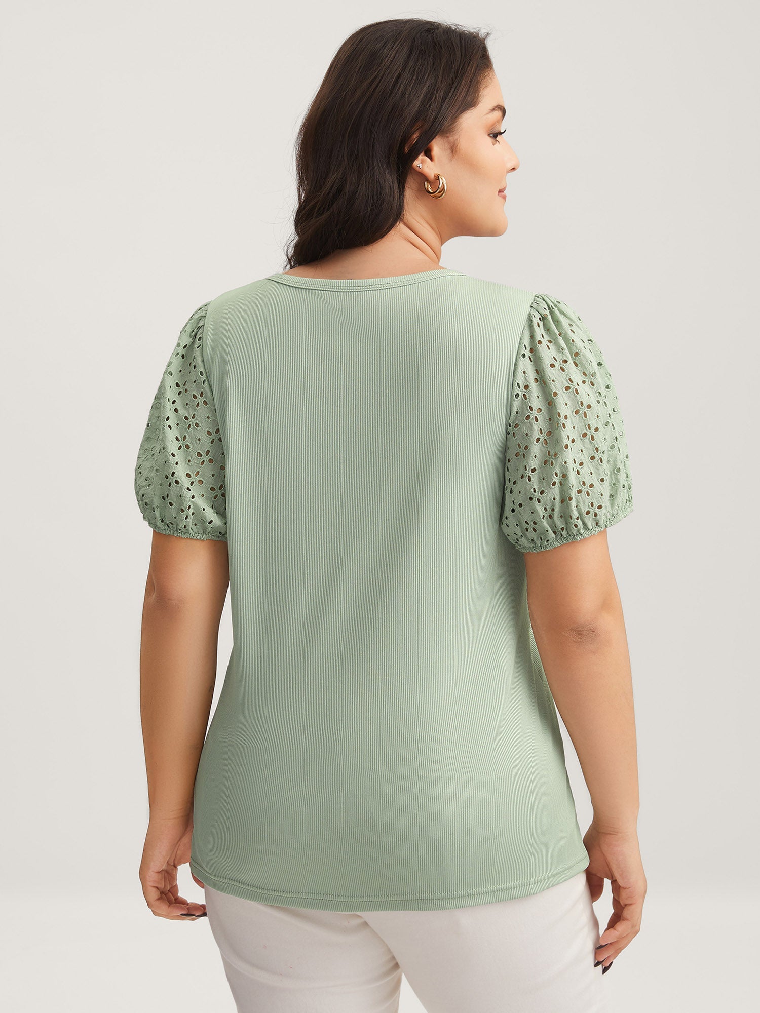 Eyelet Trim Solid Puffy Sleeve Knit Top