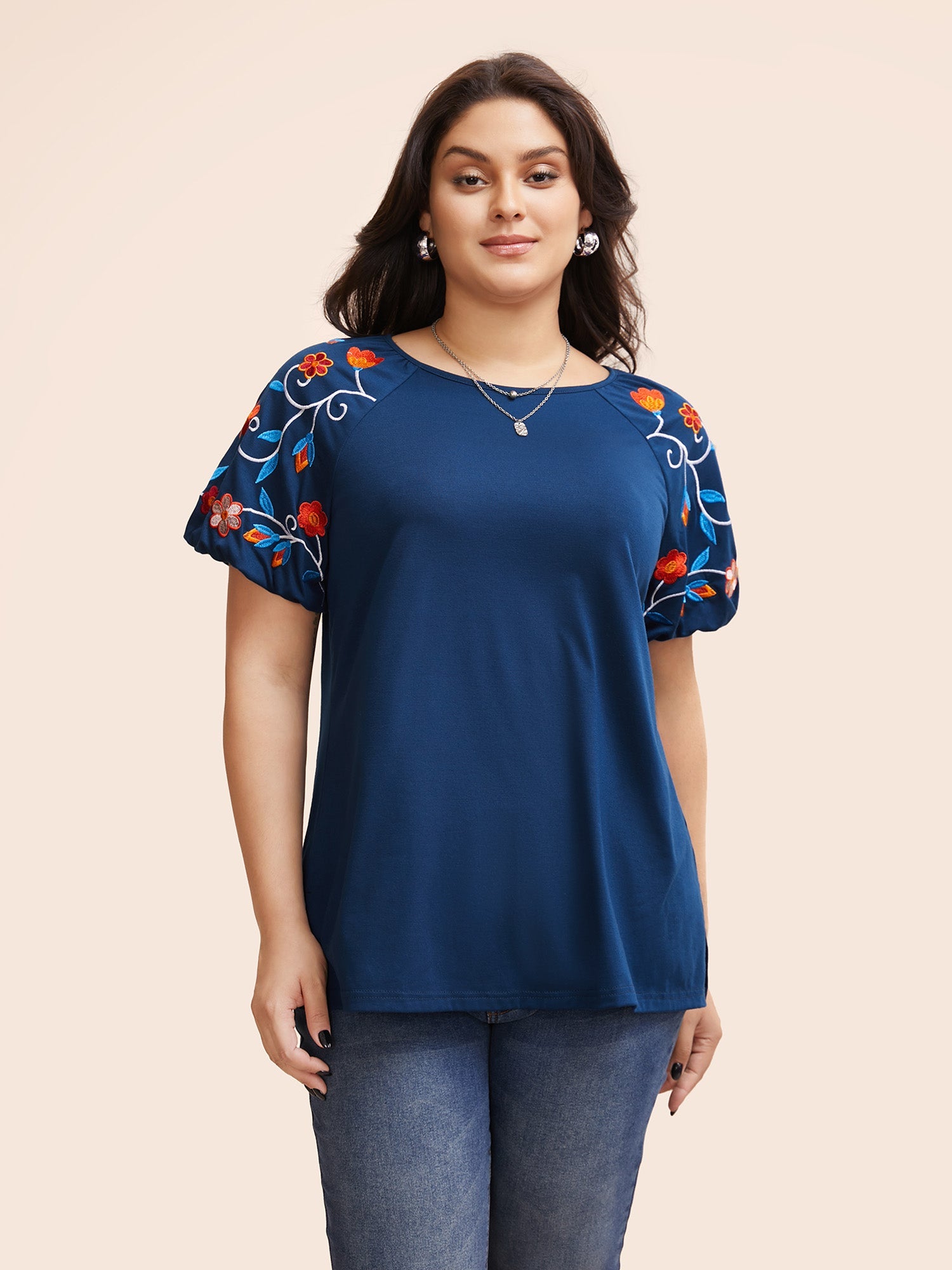 Floral Embroidered Lantern Sleeve T-shirt